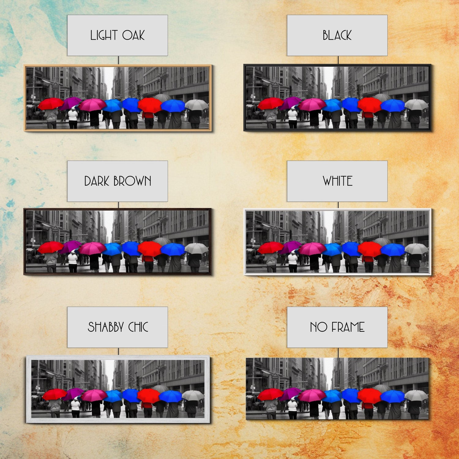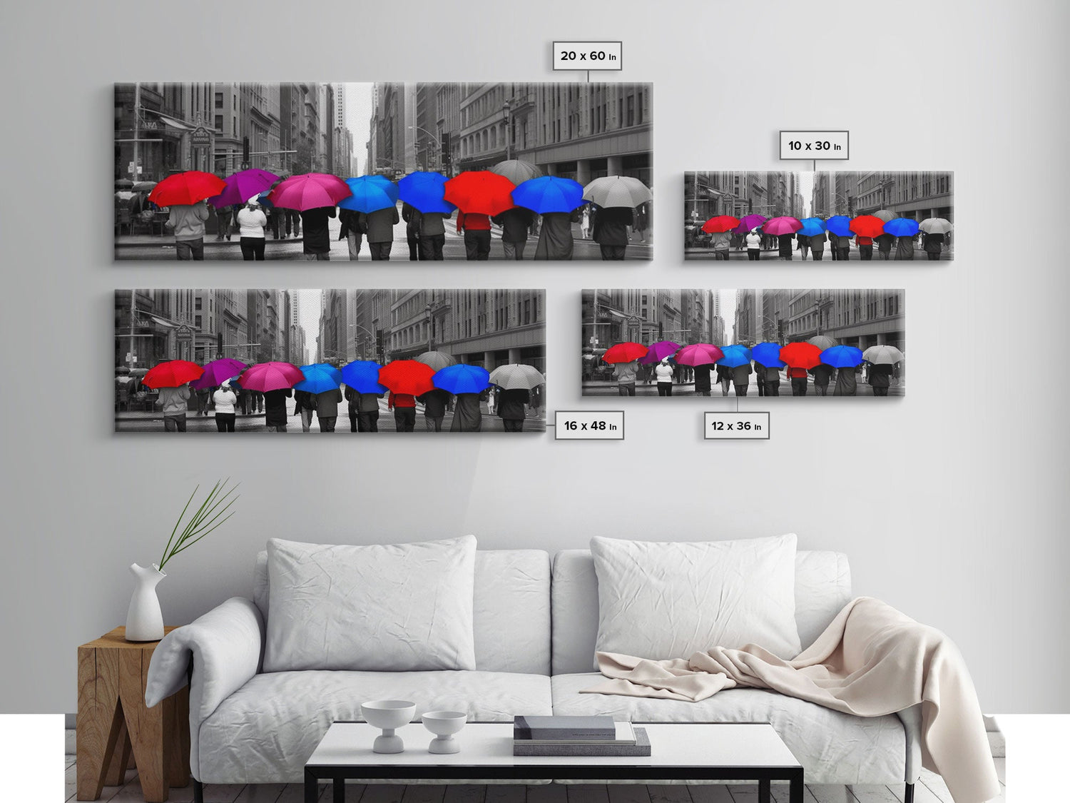 Pink Red Blue Purple Colored Umbrellas, People Walking On Street, City Art, Urban Canvas Art Print, Panoramic, Wall Art, Canvas Print - 10x30 Inches / No Frame - Stretched Canvas Only is backordered and will ship as soon as it is back in stock.