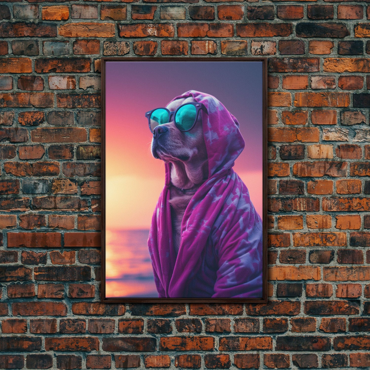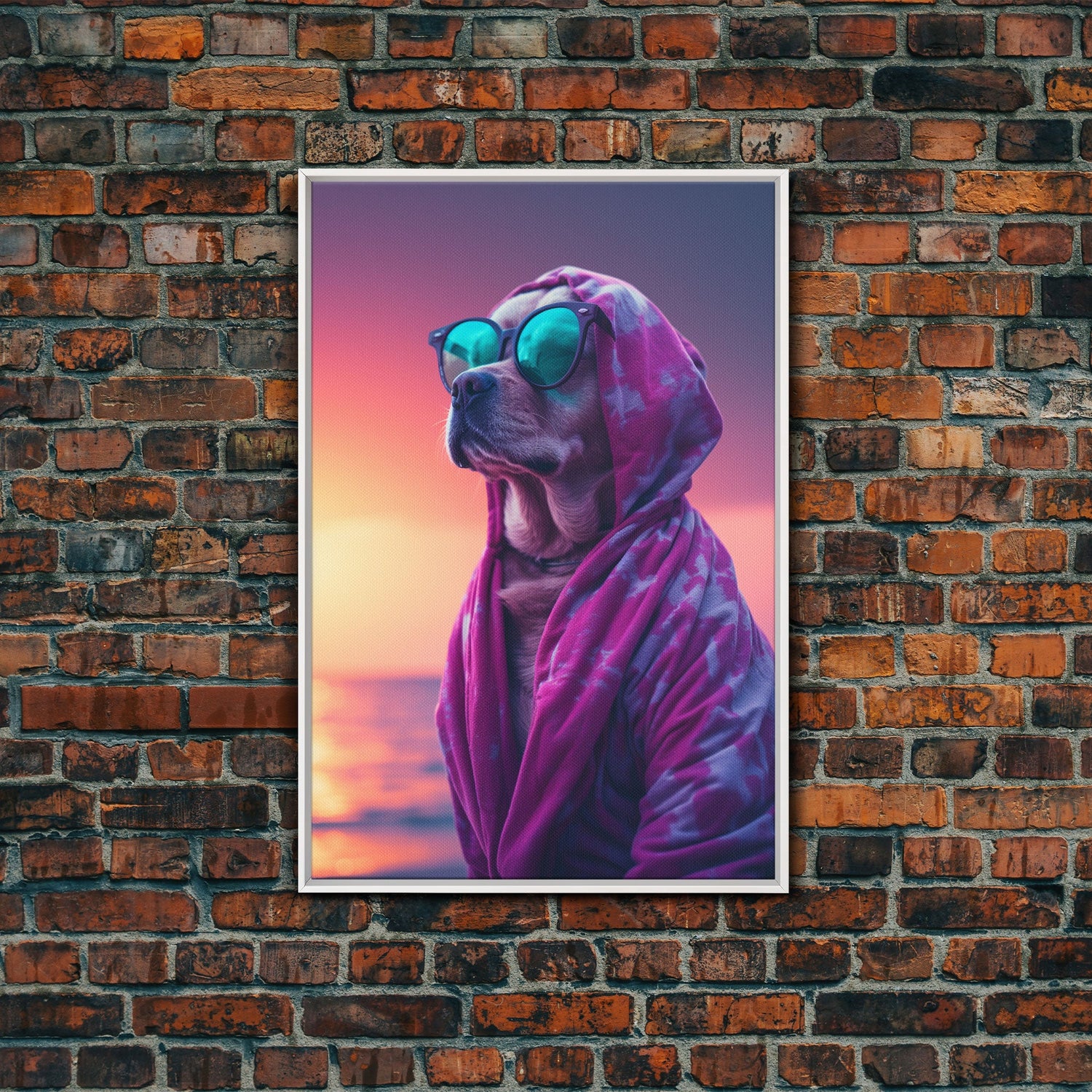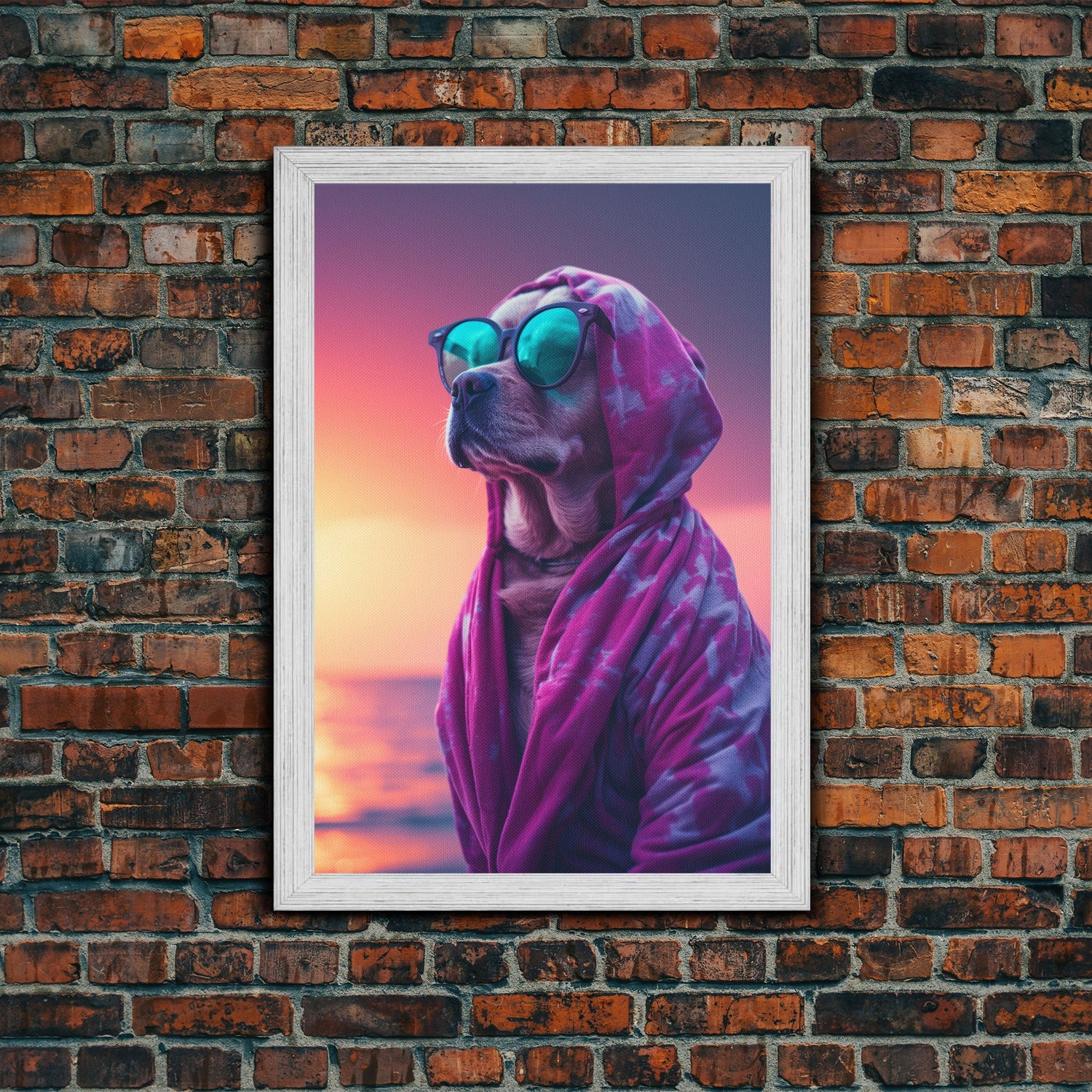 Pit Bull In Pink Hoodie Sunglasses Wall Print, Beach Art, Dog Print, Dog Portrait, Framed Wall Art, Framed Canvas, Wall Print, Wall Canvas
