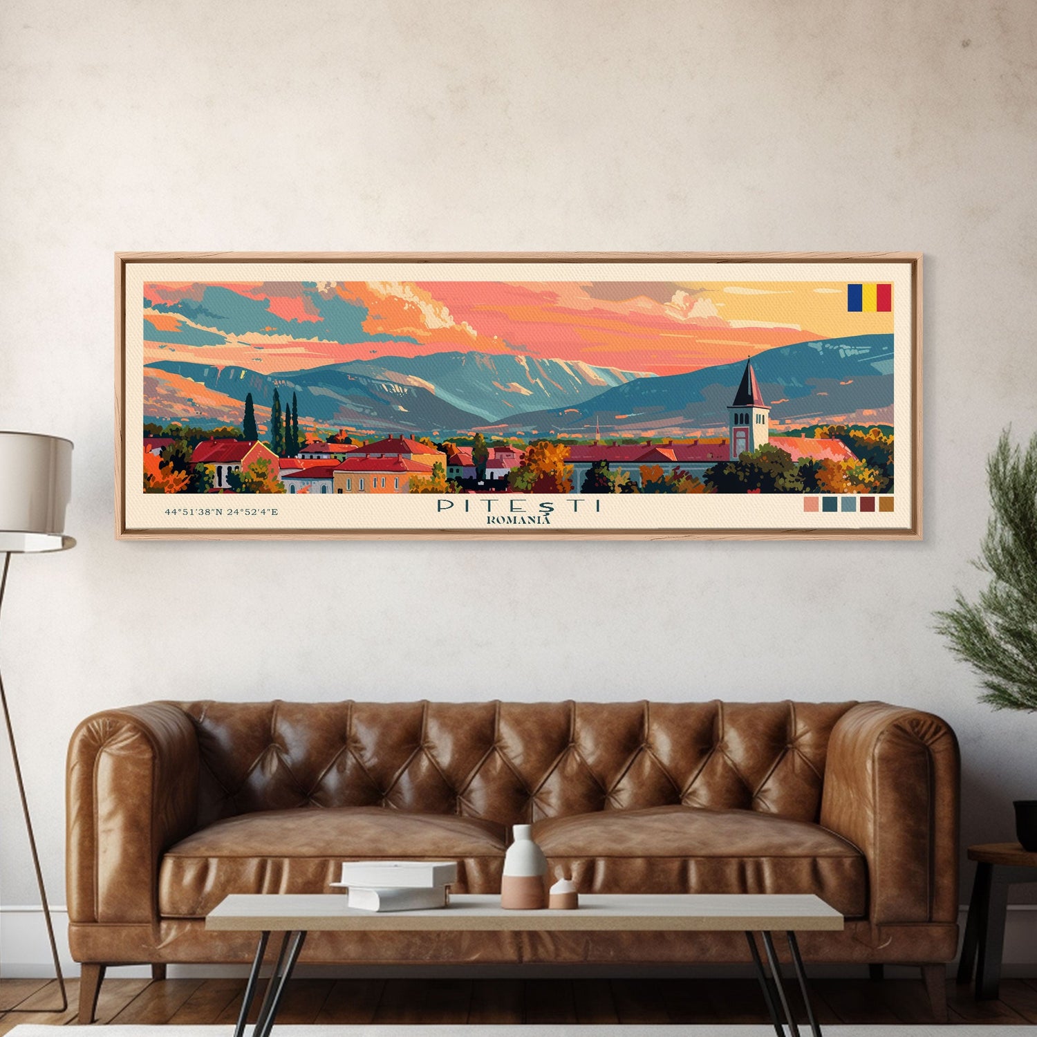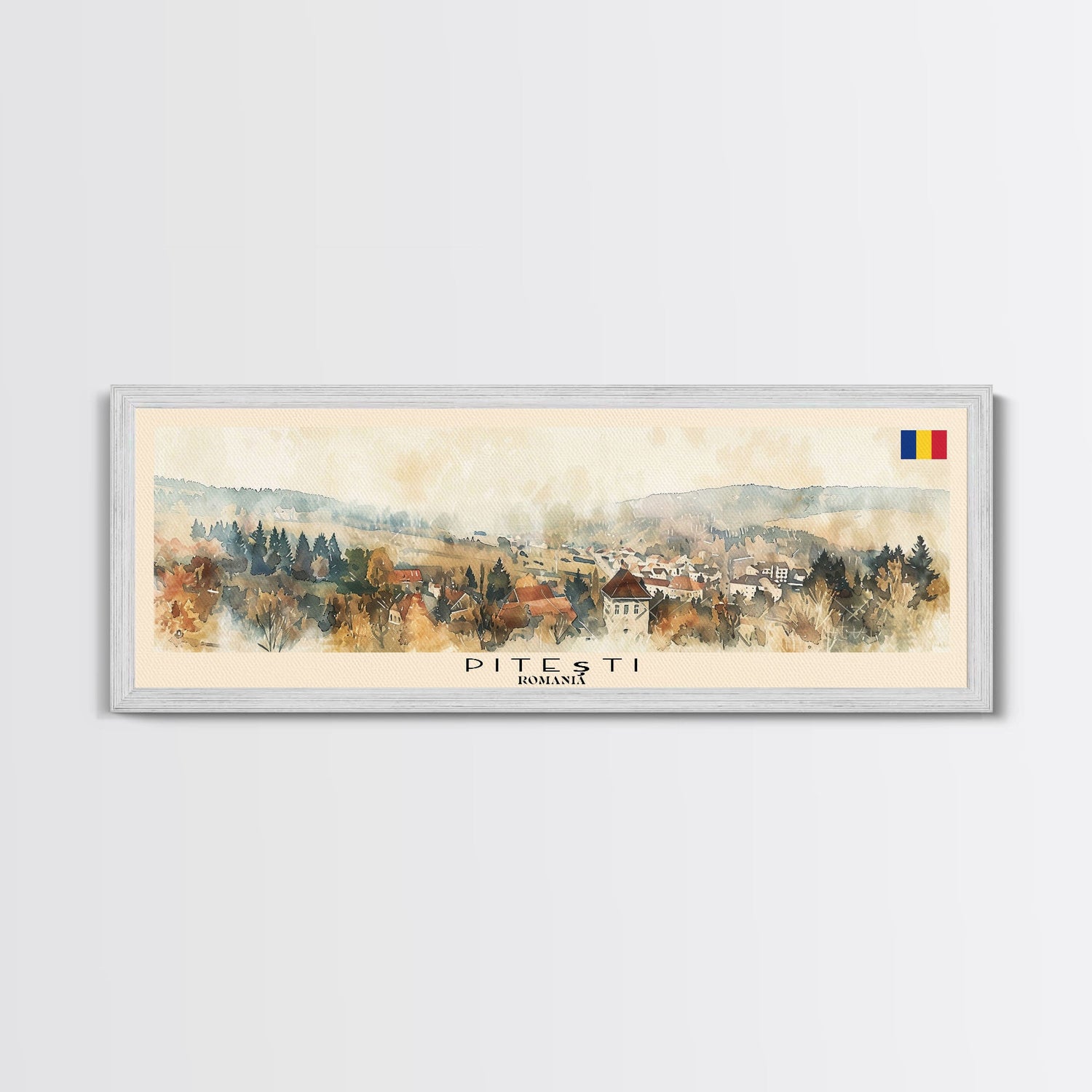 Piteti Romania Panoramic Travel Poster, Framed Canvas Print or Metal Wall Art, Travel Art, Home Decor, Panoramic Painting, Midcentury Art
