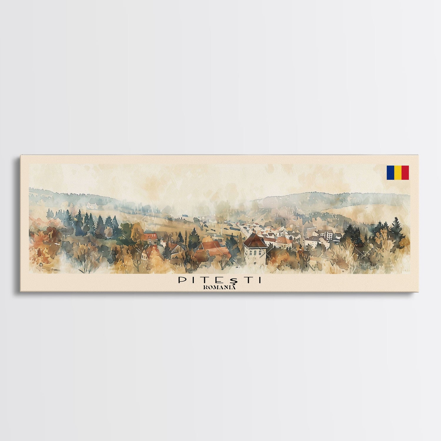 Piteti Romania Panoramic Travel Poster, Framed Canvas Print or Metal Wall Art, Travel Art, Home Decor, Panoramic Painting, Midcentury Art - 10x30 Inches / No Frame - Stretched Canvas Only is backordered and will ship as soon as it is back in stock.