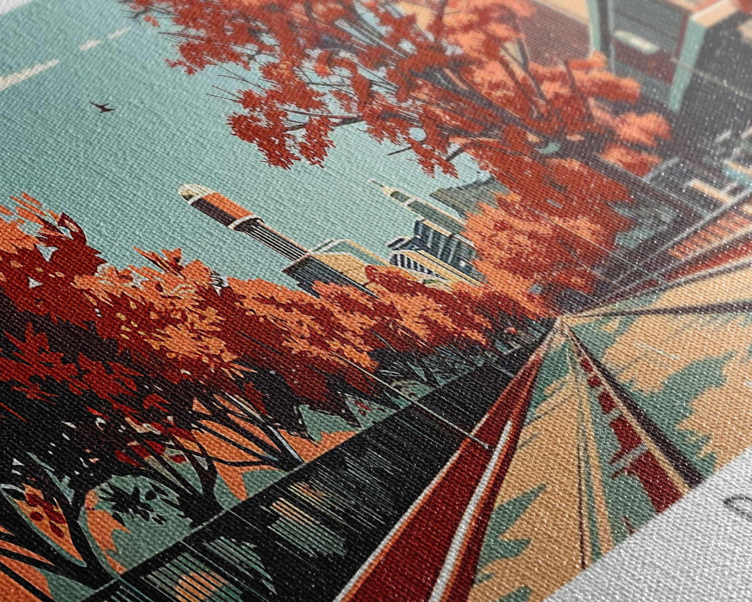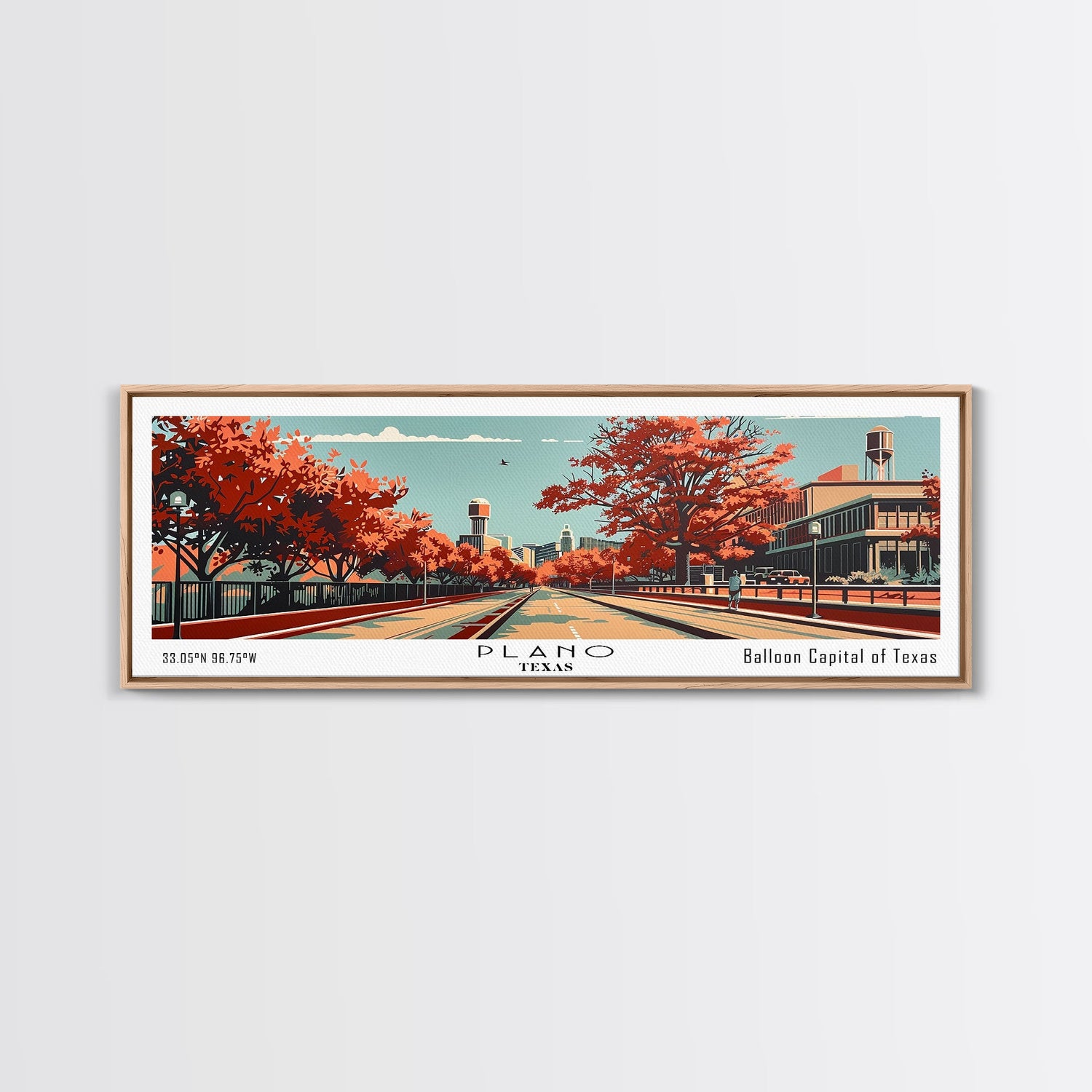 Plano Texas Panoramic Painting, Mid Century Modern Framed Canvas Print, Retro Pop Art Travel Poster, Living Room Decor, City Art