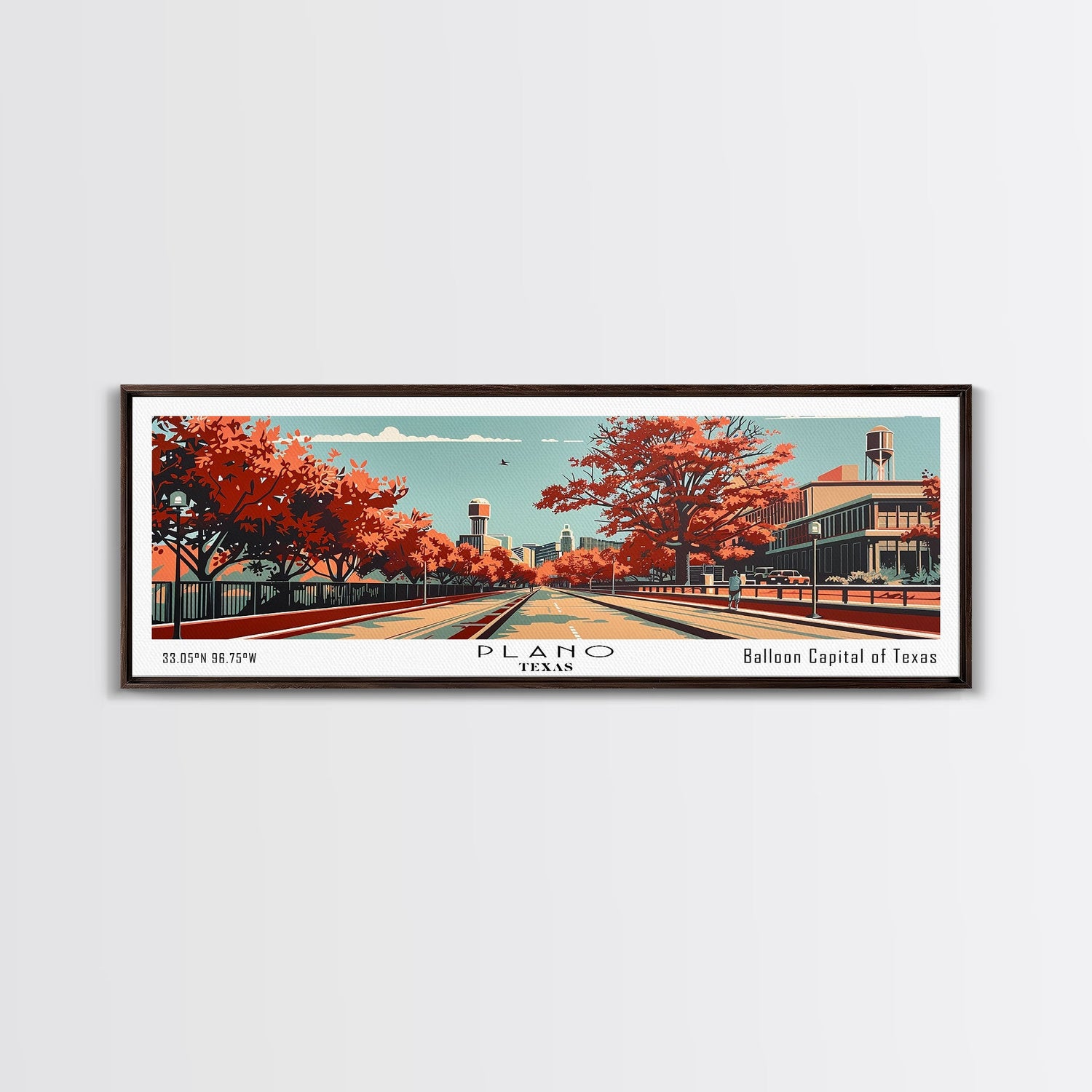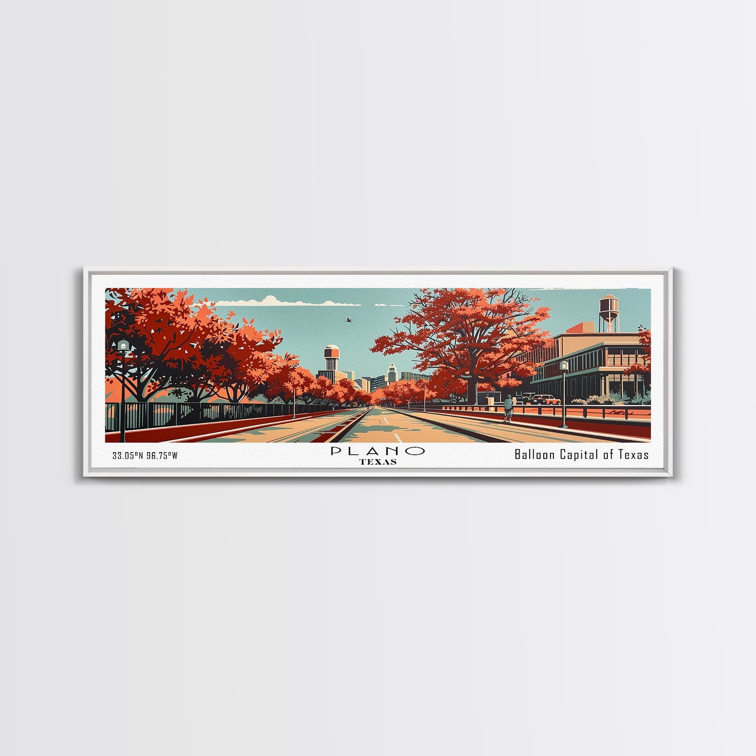 Plano Texas Panoramic Painting, Mid Century Modern Framed Canvas Print, Retro Pop Art Travel Poster, Living Room Decor, City Art - 10x30 Inches / No Frame - Stretched Canvas Only is backordered and will ship as soon as it is back in stock.
