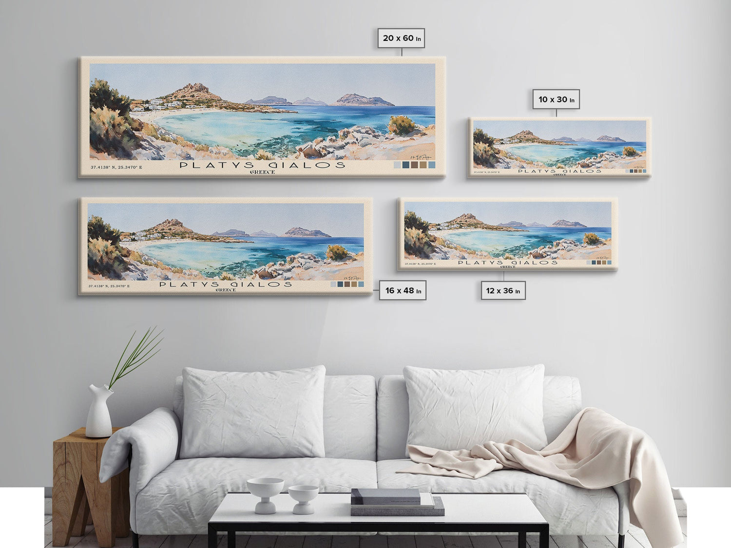 Platys Gialos, Greece Watercolor Beach Print, Vacation Gift, Greece Wall Art, Framed Canvas Print, Framed Beach Painting - 10x30 Inches / No Frame - Stretched Canvas Only is backordered and will ship as soon as it is back in stock.