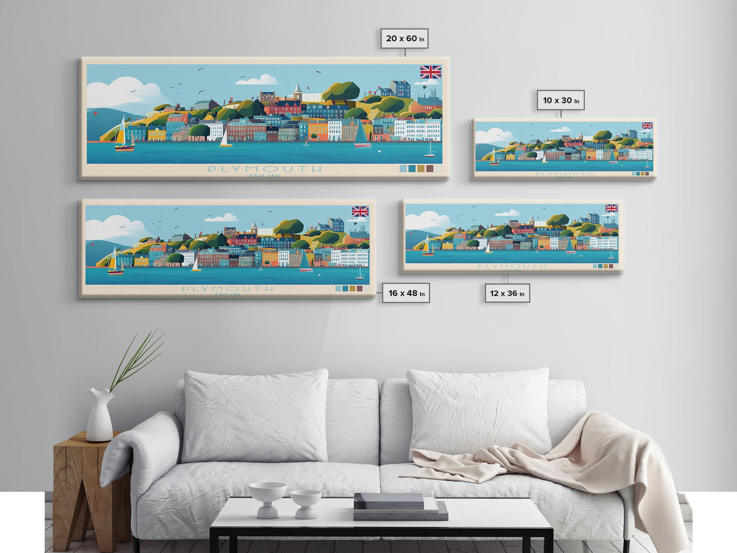 Plymouth, England Panoramic Travel Poster Canvas Print, Plymouth, England Painting, England Art, Plymouth Travel Art, Guest Room Painting - 10x30 Inches / No Frame - Stretched Canvas Only is backordered and will ship as soon as it is back in stock.