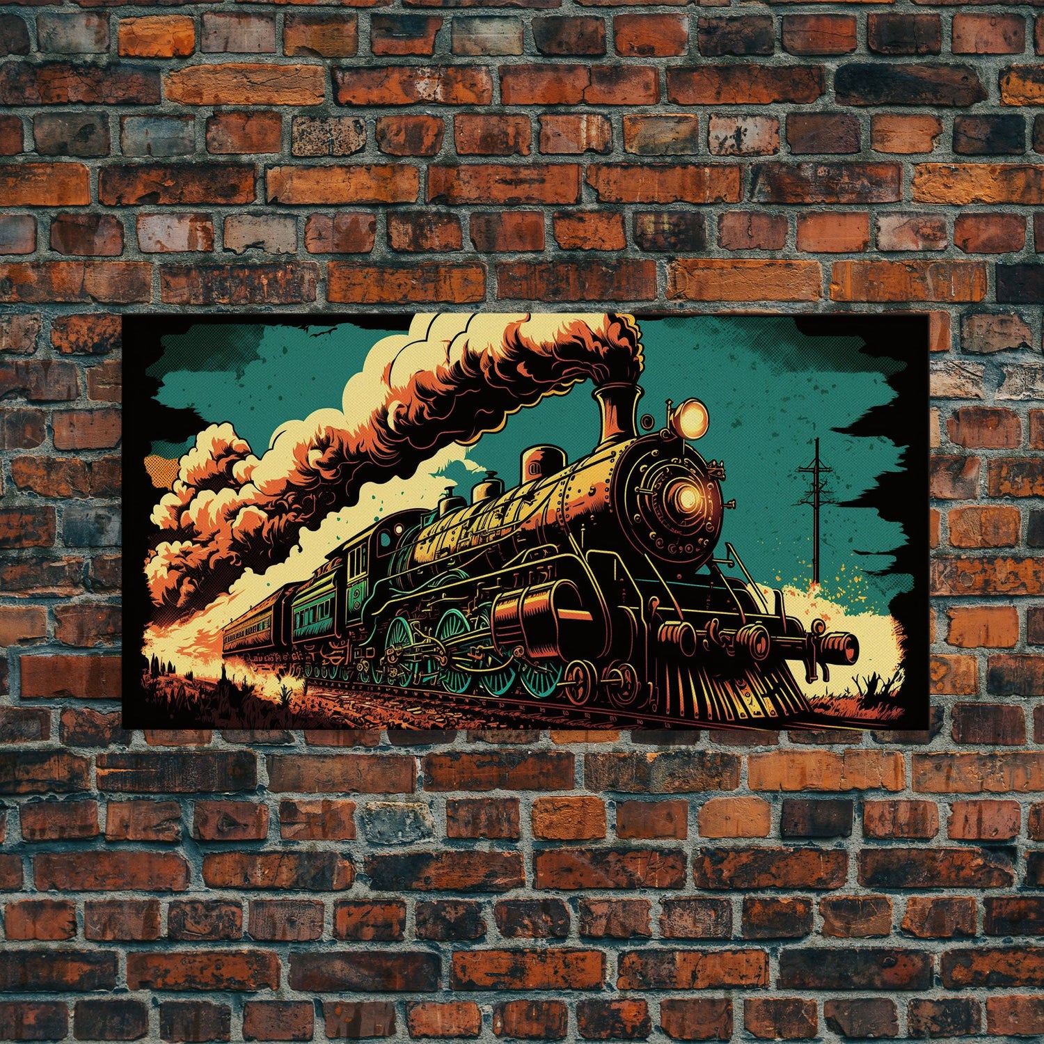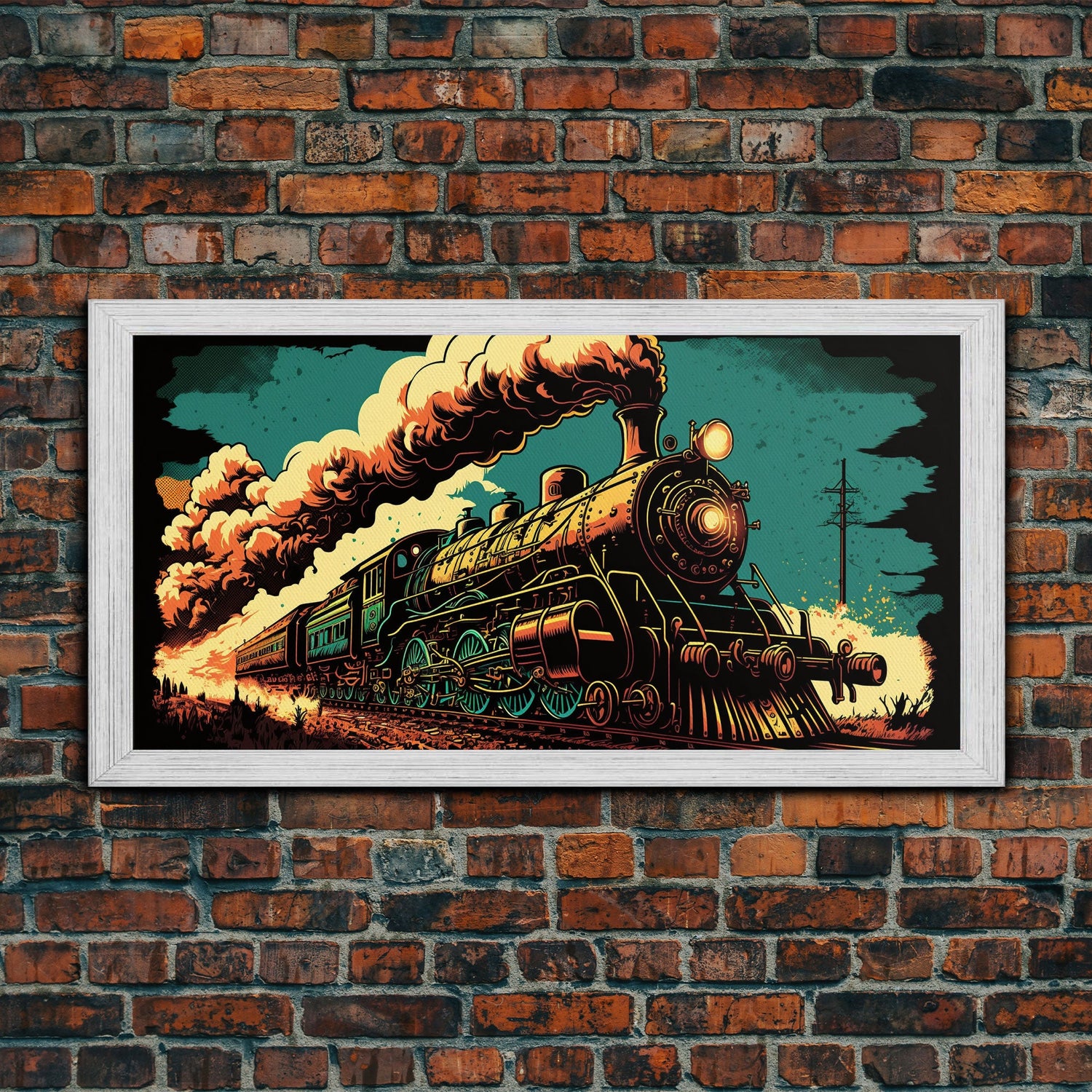 Pop Art Steam Train, Framed Canvas Print, Cool Wild West Decor, Western Art, Framed Colorful Pop Art - 10x20 Inches / No Frame - Stretched Canvas Only is backordered and will ship as soon as it is back in stock.
