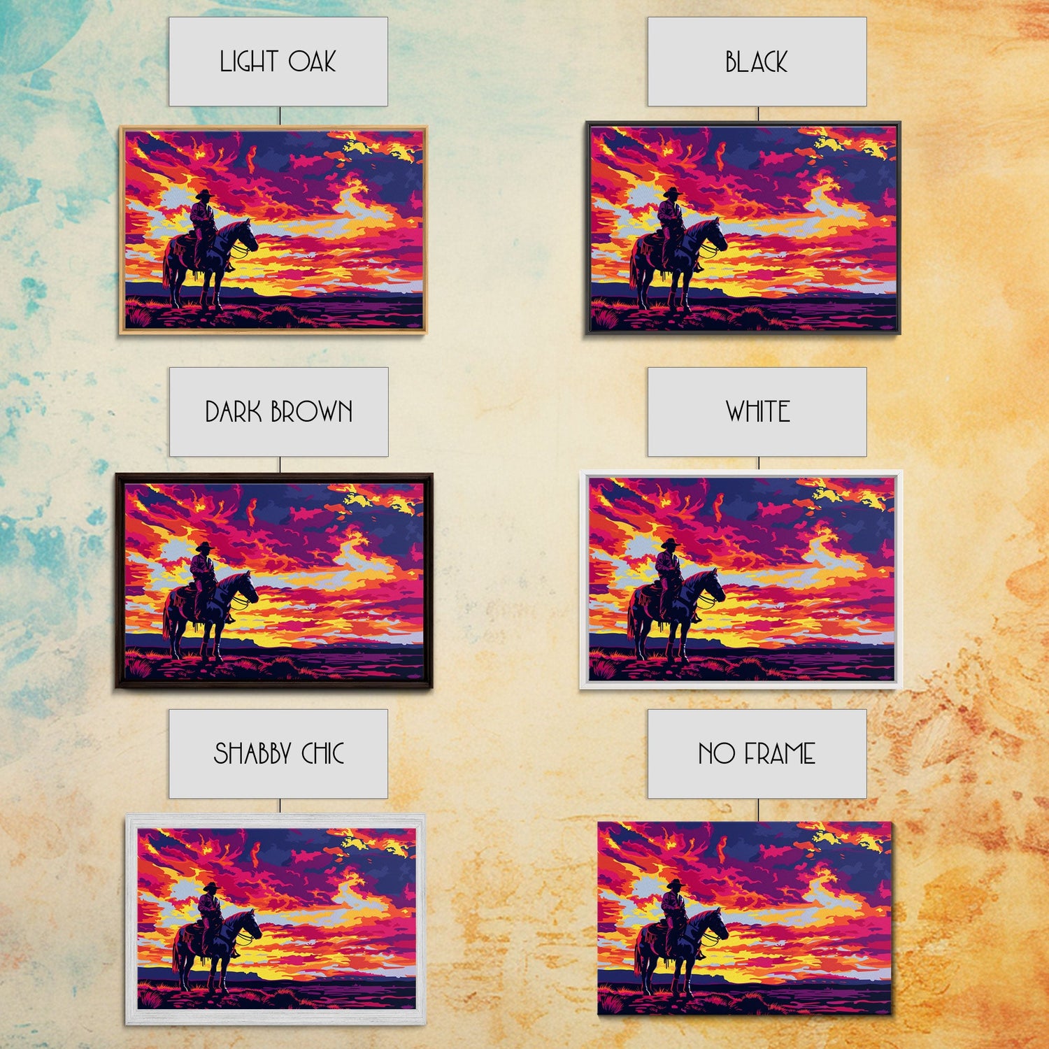 Pop Art Sunset Cowboy Painting Framed Canvas Print, Wild West Wall Art, Cowboy Print, Western Decor, Kitsch Whimsical Art - 8x12 Inches / No Frame - Stretched Canvas Only is backordered and will ship as soon as it is back in stock.