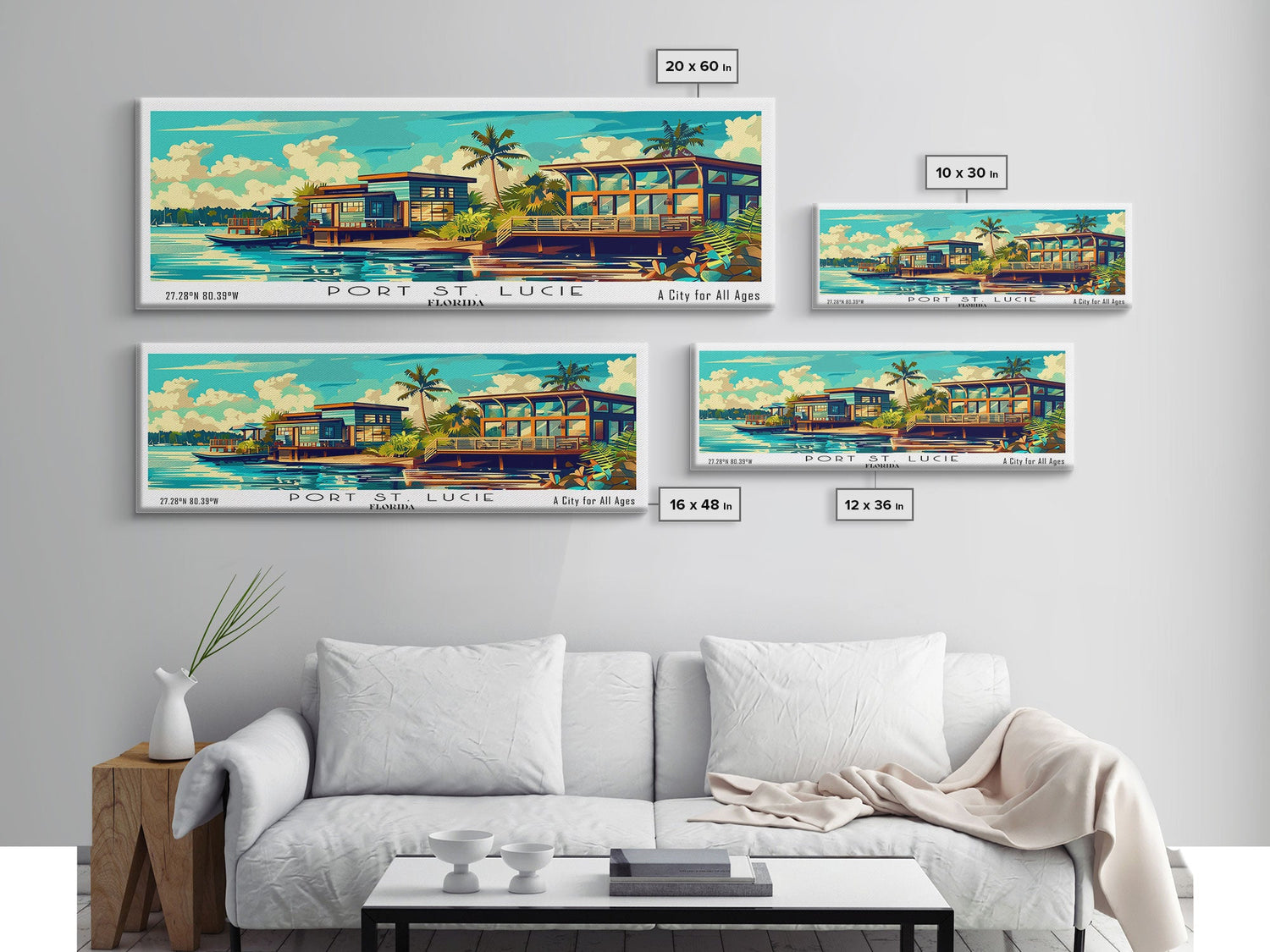 Port St. Lucie Florida Panoramic Framed Canvas Print, Retro Style Wall Art, Mid Century Modern Home Decor, Pop Art Travel Poster - 10x30 Inches / No Frame - Stretched Canvas Only is backordered and will ship as soon as it is back in stock.