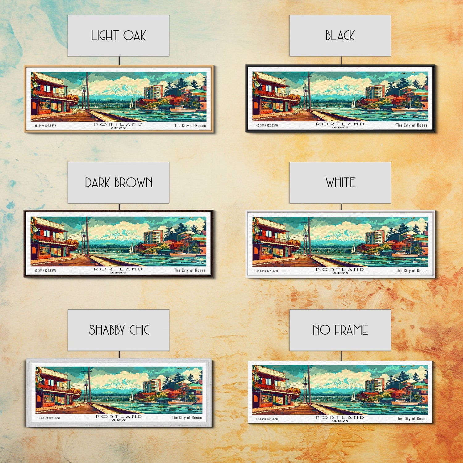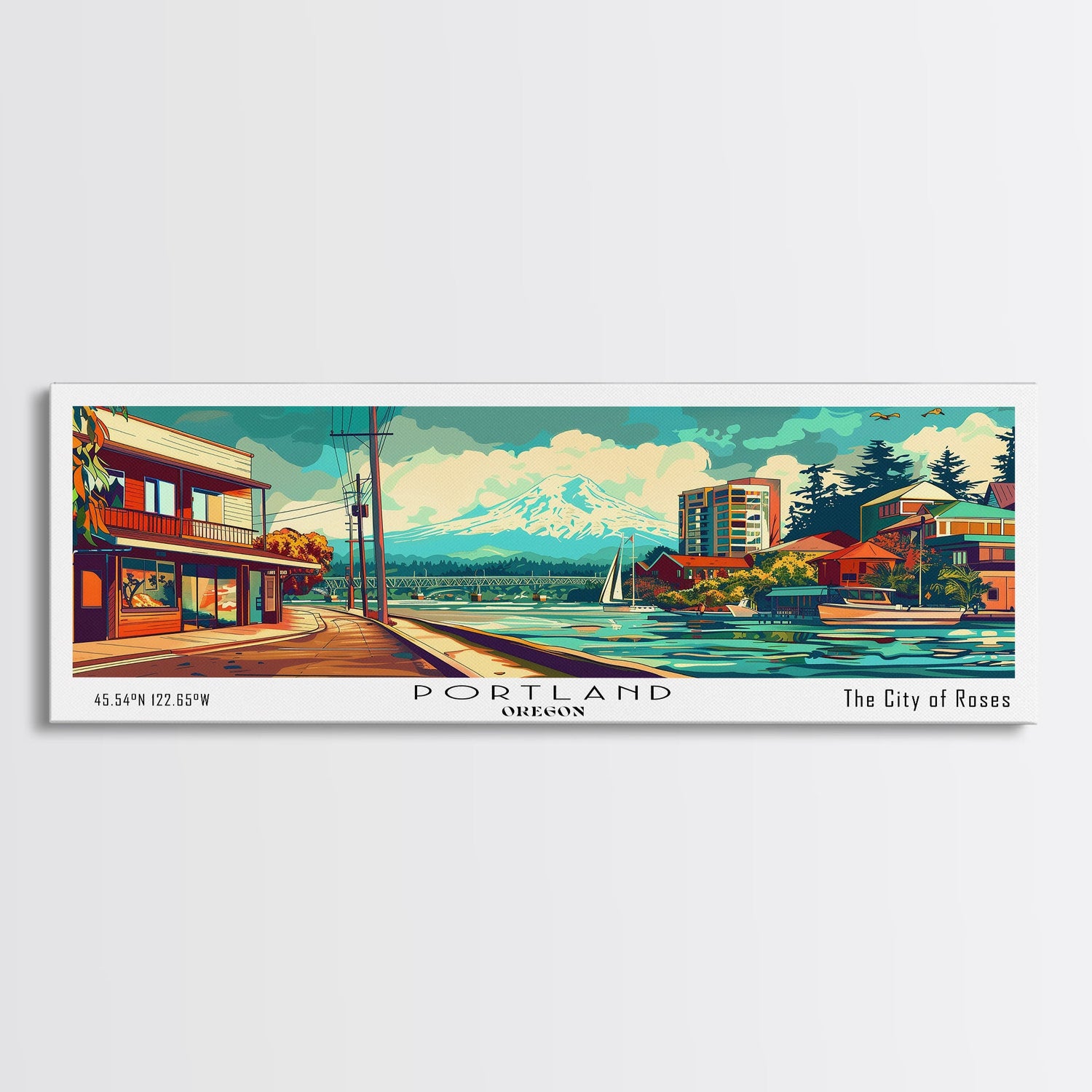 Portland Oregon Panoramic Painting, Mid Century Modern Framed Canvas Print, Retro Style Wall Art, Pop Art Travel Poster