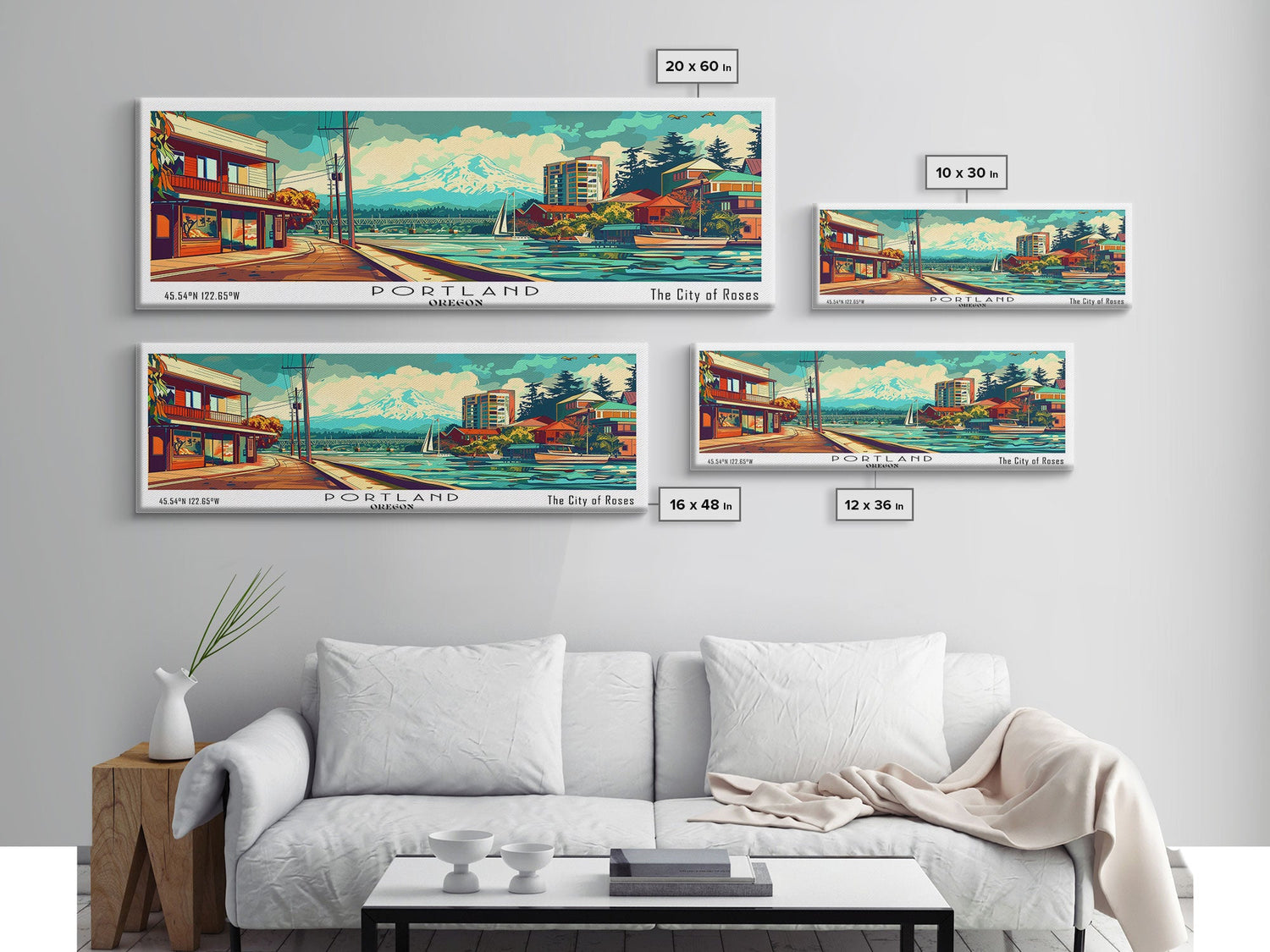 Portland Oregon Panoramic Painting, Mid Century Modern Framed Canvas Print, Retro Style Wall Art, Pop Art Travel Poster - 10x30 Inches / No Frame - Stretched Canvas Only is backordered and will ship as soon as it is back in stock.