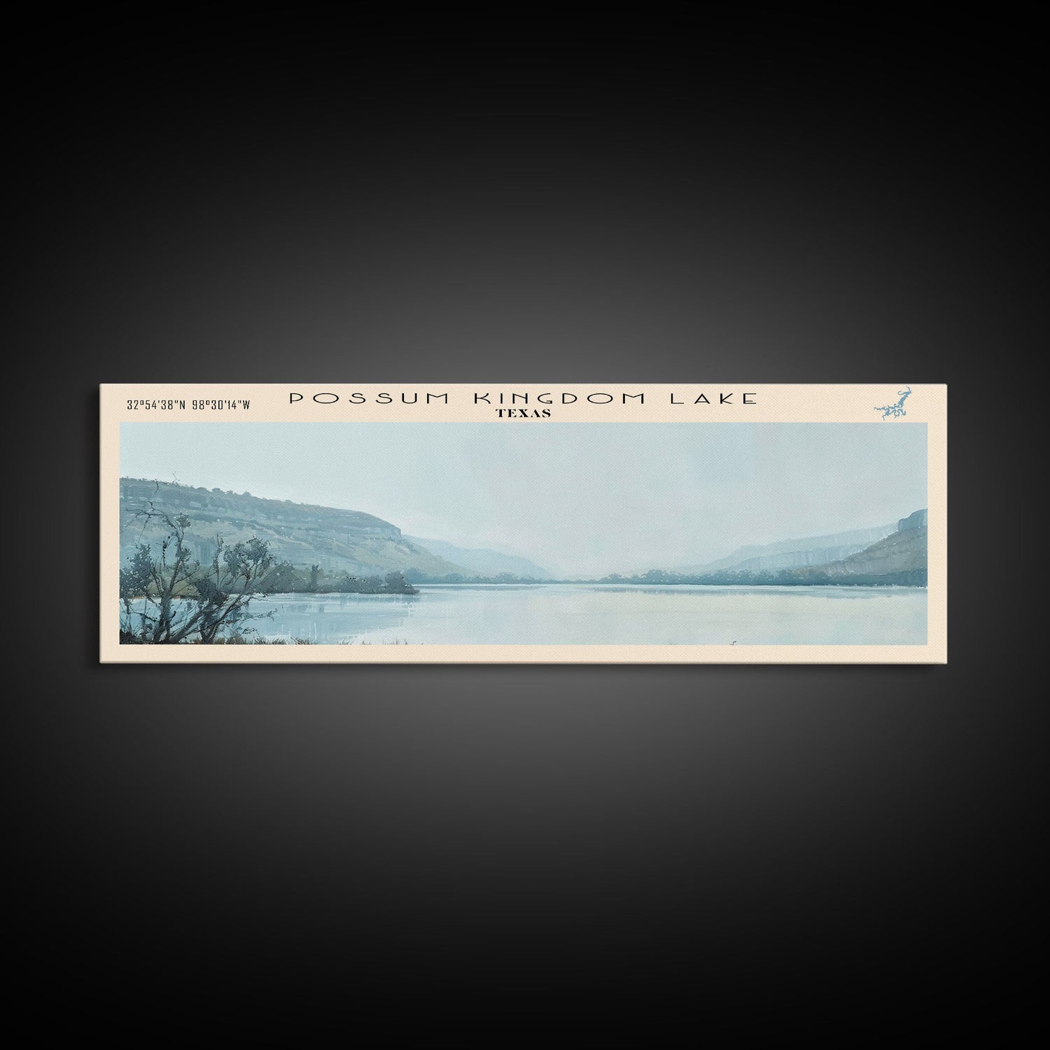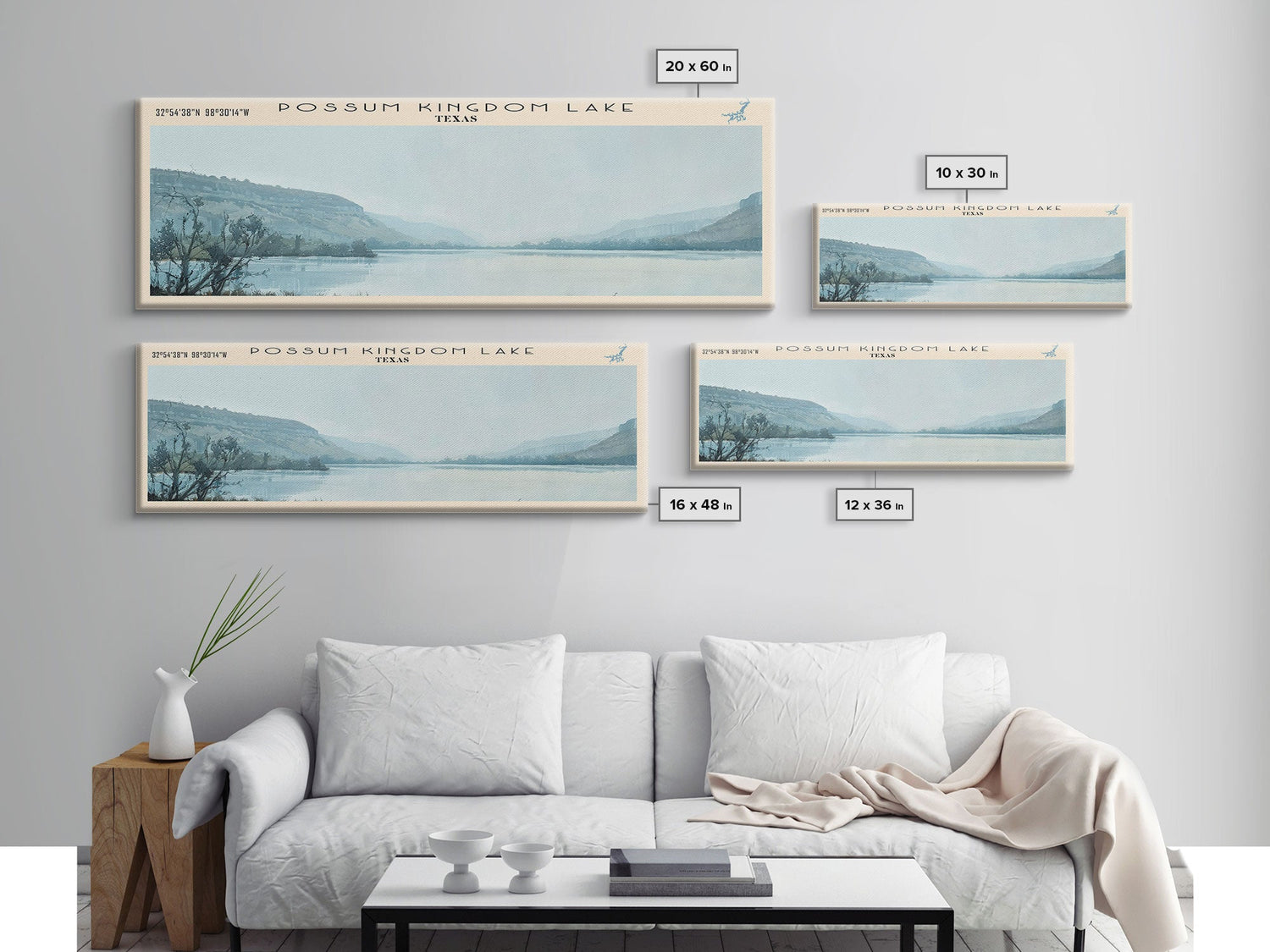 Possum Kingdom Lake Texas Framed Canvas Print, Lake House Decor, Panoramic Travel Poster, Scenic Wall Art, Modern Art - 10x30 Inches / No Frame - Stretched Canvas Only is backordered and will ship as soon as it is back in stock.