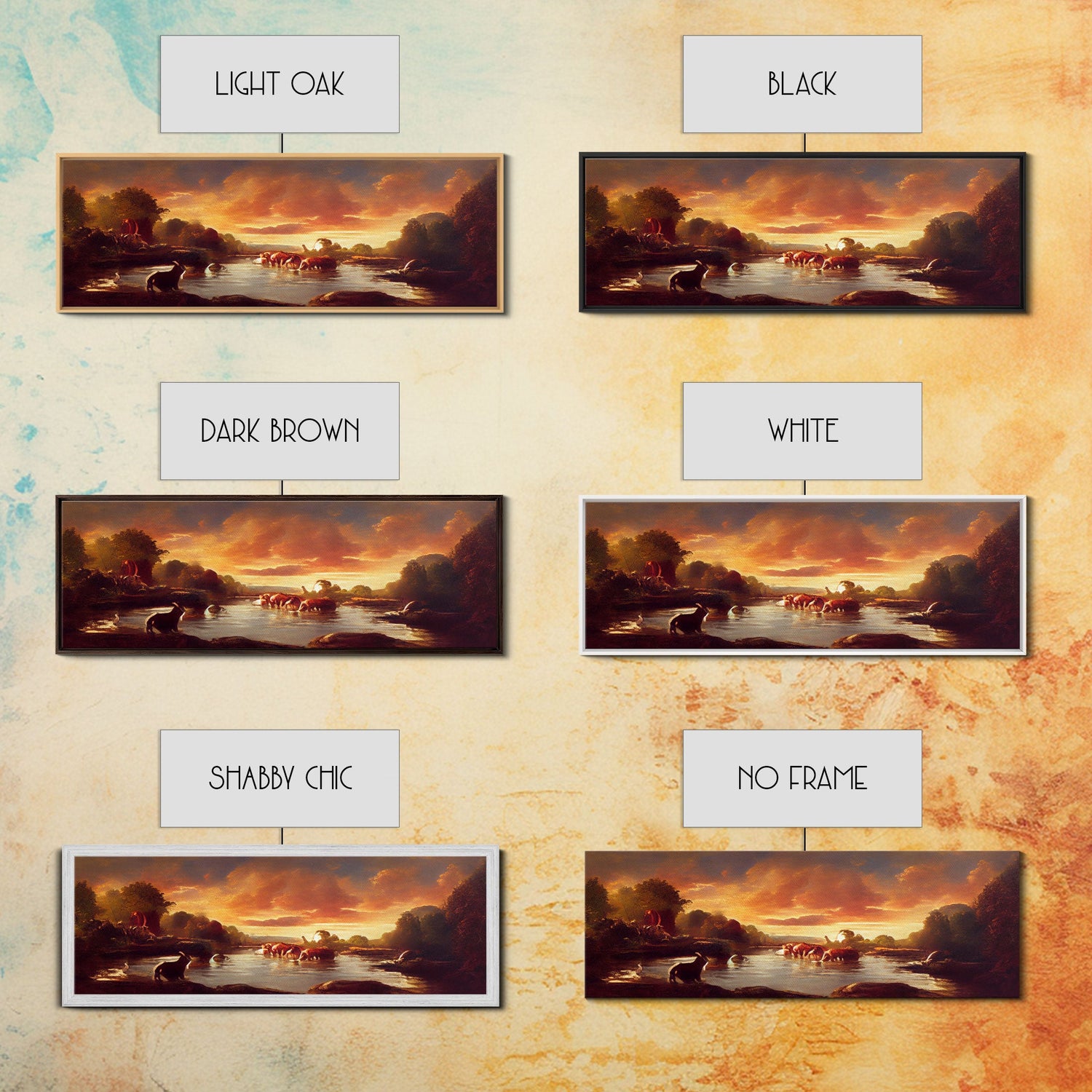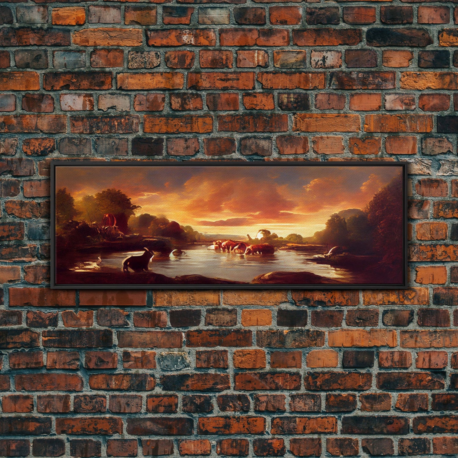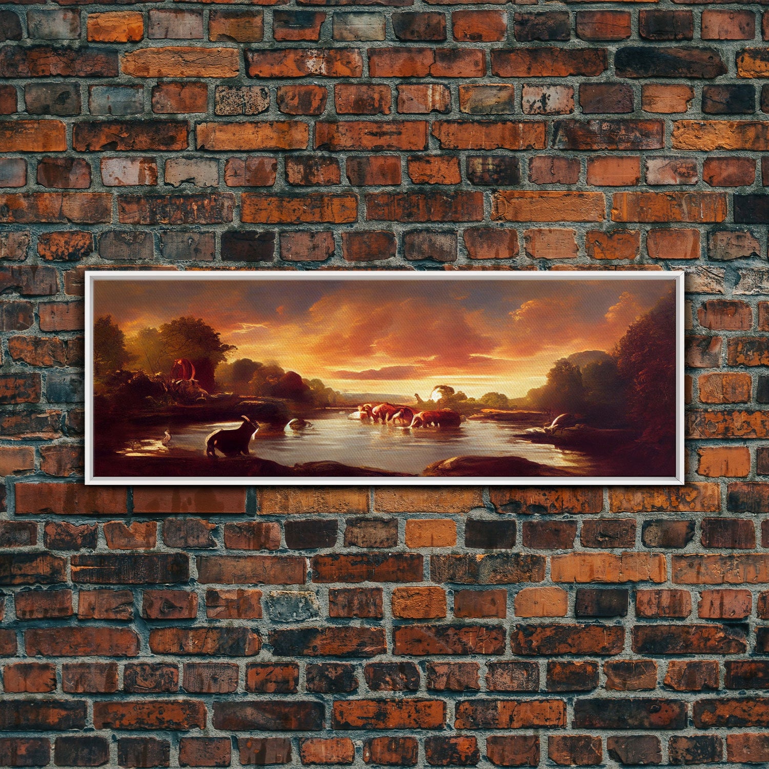 Prehistoric Dinosaur Abstract Landscape Art, Ready To Hang Canvas Print, Panoramic Art, Dinosaurs At Sunset