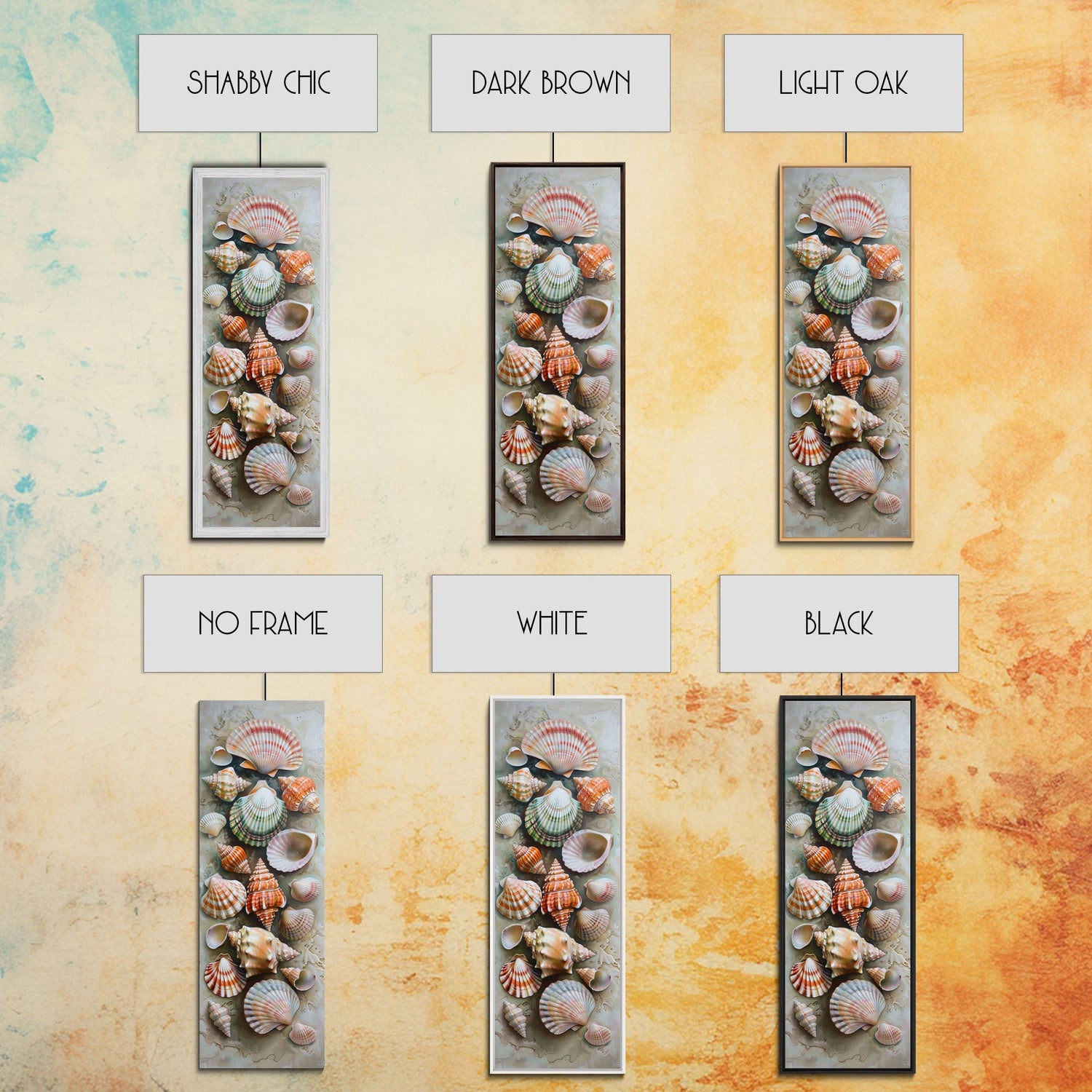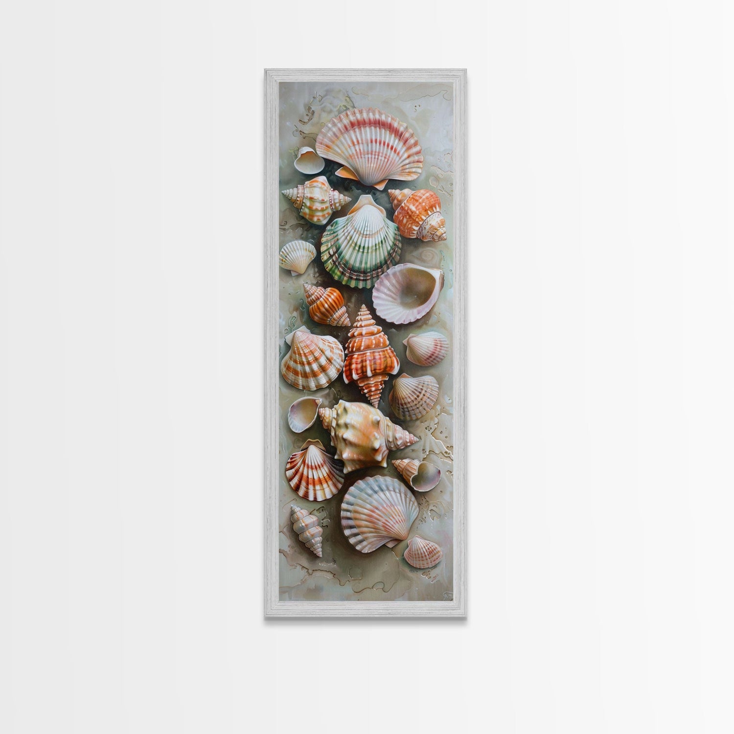 Printed Canvas Painting of Colorful Seashells on Beach, Vertical Coastal Art Print, Oversized Wall Art for Living Room, Housewarming Gift - 10x30 Inches / No Frame - Stretched Canvas Only is backordered and will ship as soon as it is back in stock.