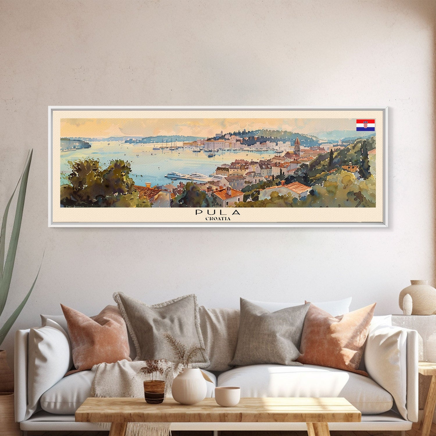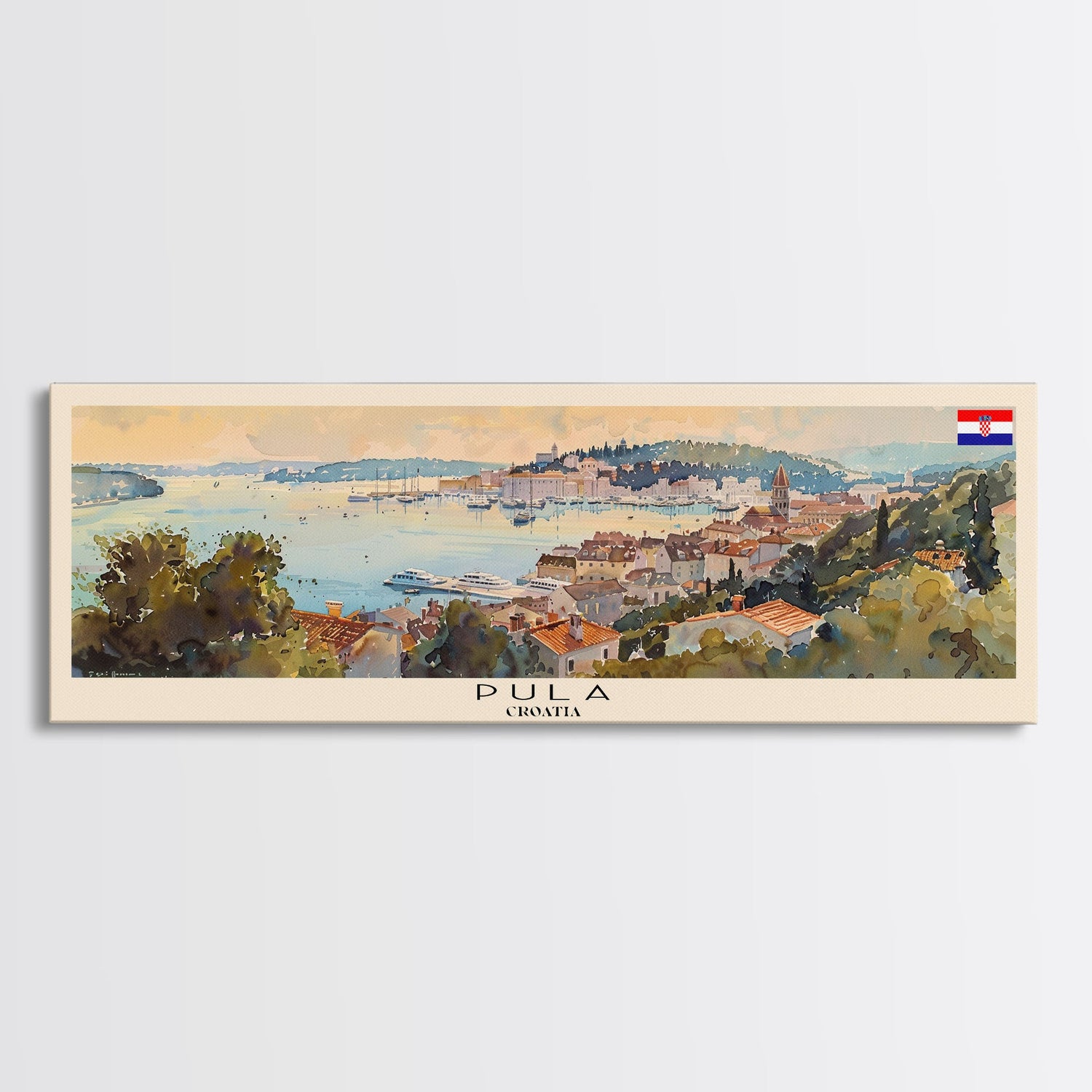 Pula Croatia Panoramic Travel Poster, Framed Canvas Print or Metal Wall Art, Travel Art, Home Decor, Panoramic Painting, Midcentury Art - 10x30 Inches / No Frame - Stretched Canvas Only is backordered and will ship as soon as it is back in stock.