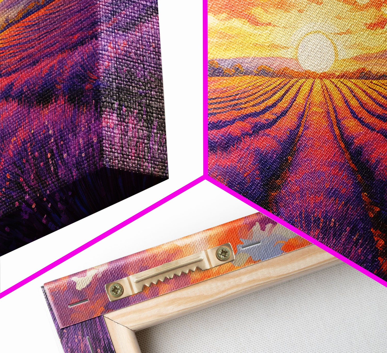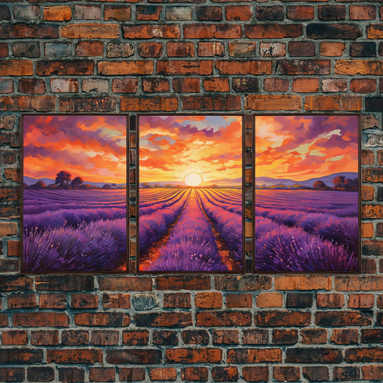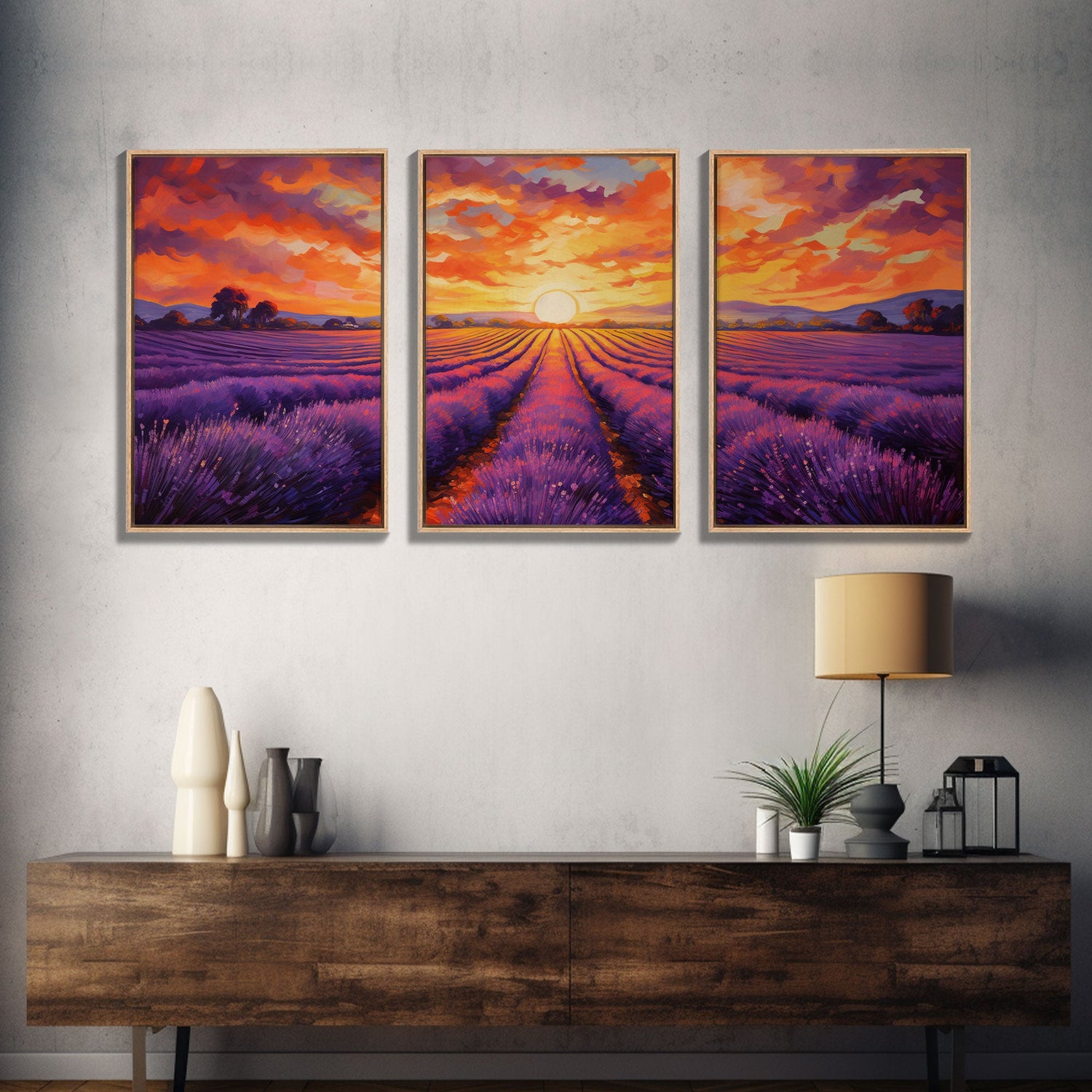 Purple Lavender Fields, 3 Piece Wall Art, Framed Canvas Print, Beautiful Original Landscape Painting, Sunset Painting, Farmhouse Decor