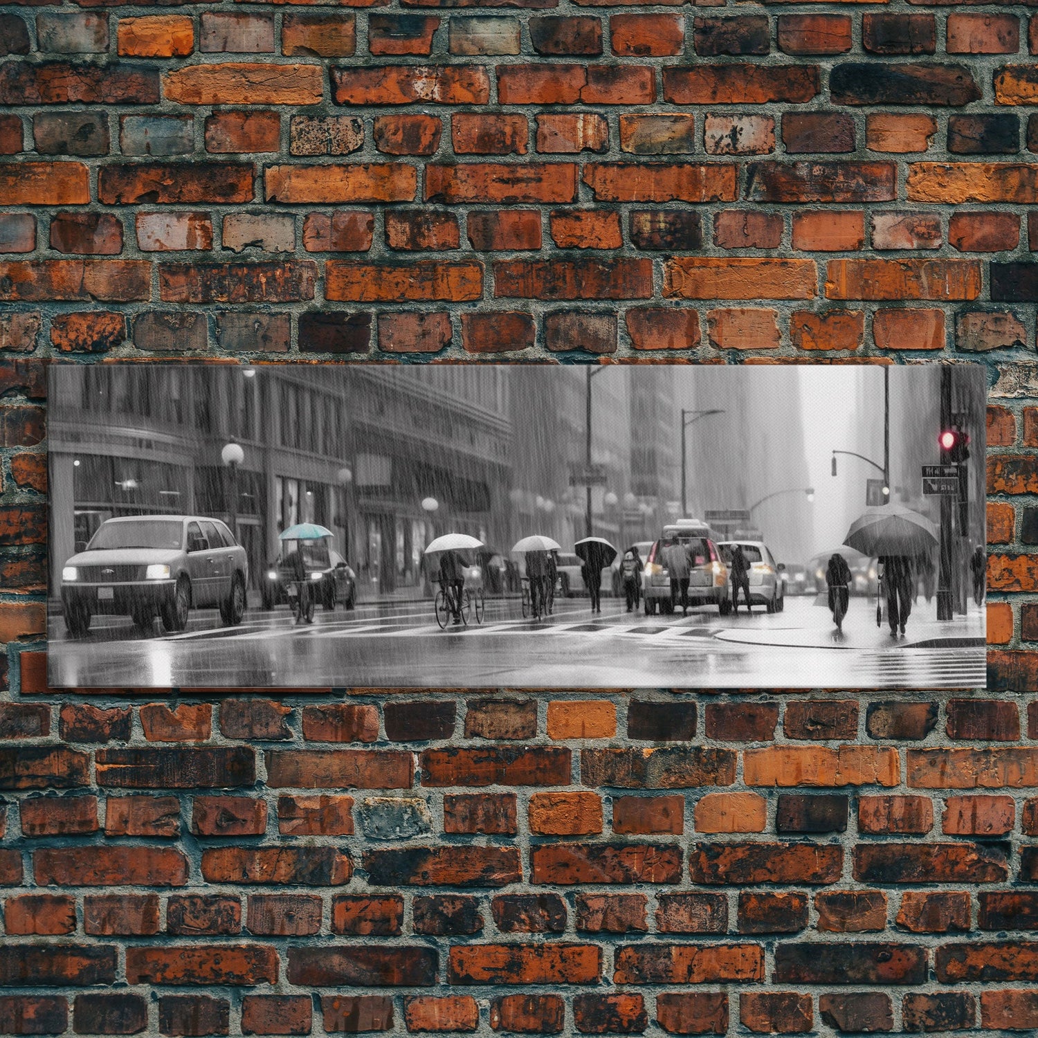 Rainy Day In The City Canvas Print, People With Umbrellas, City Art, Wall Decor, Large Urban Art Print, Panoramic, Wall Art, Canvas Print