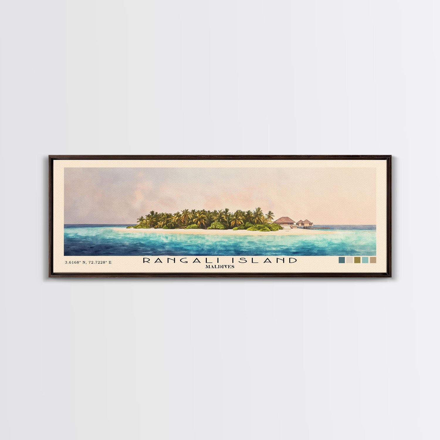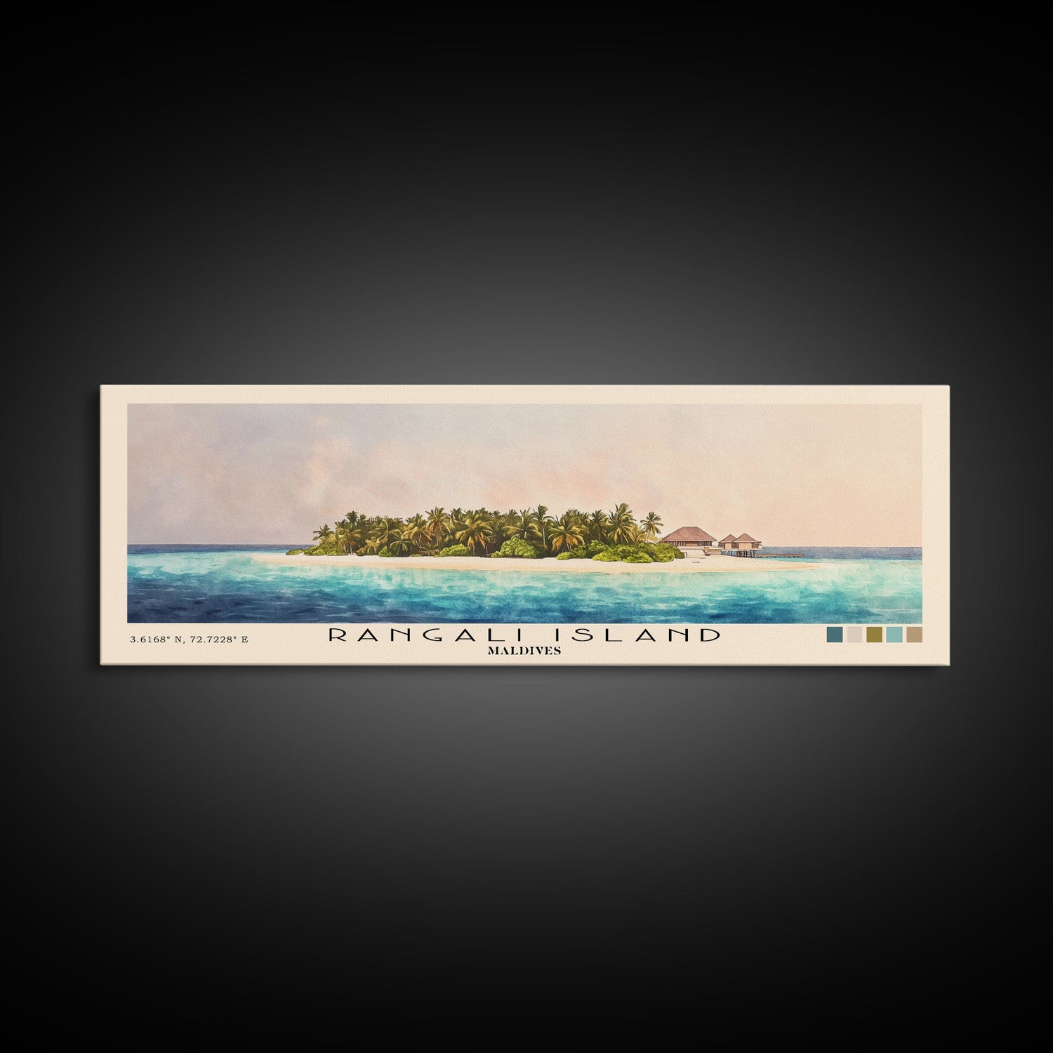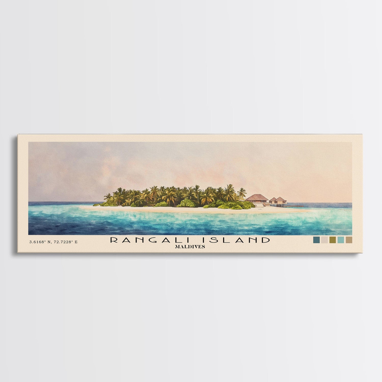 Rangali Island, Maldives Watercolor Beach Print, Vacation Gift, Maldives Wall Art, Framed Canvas Print, Framed Beach Painting - 10x30 Inches / No Frame - Stretched Canvas Only is backordered and will ship as soon as it is back in stock.