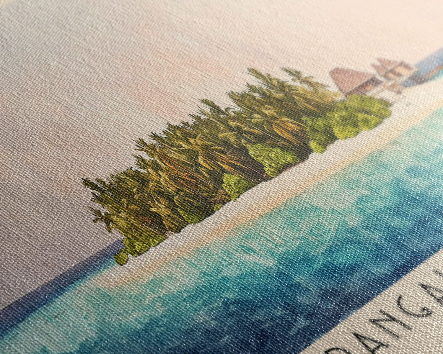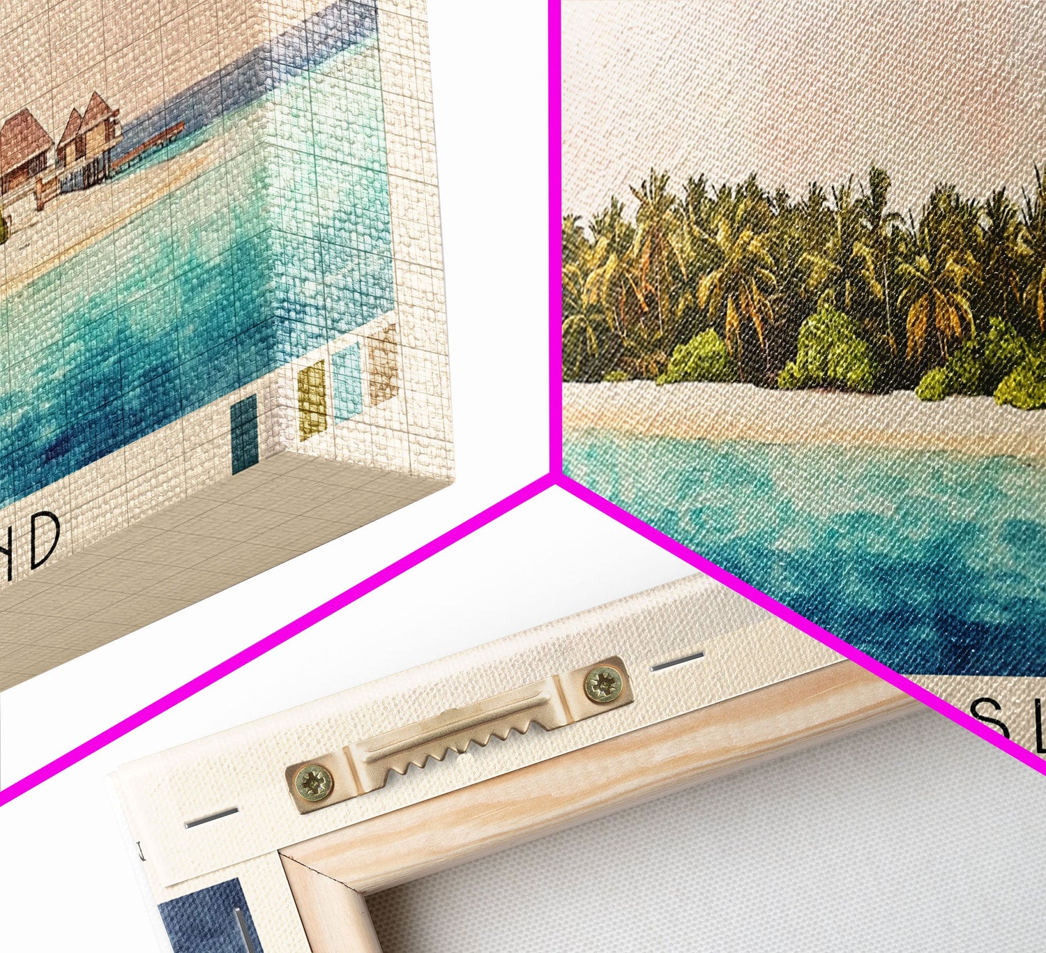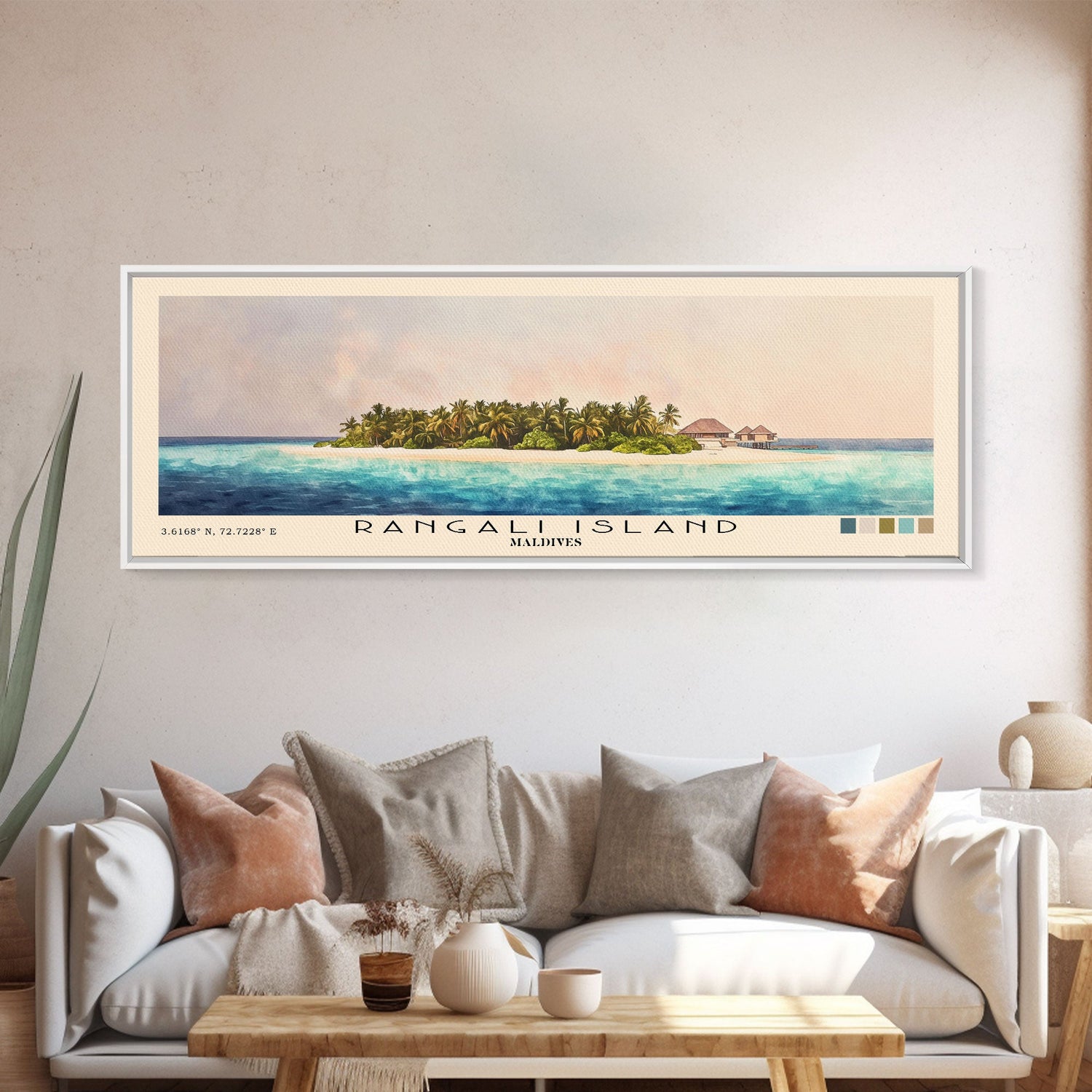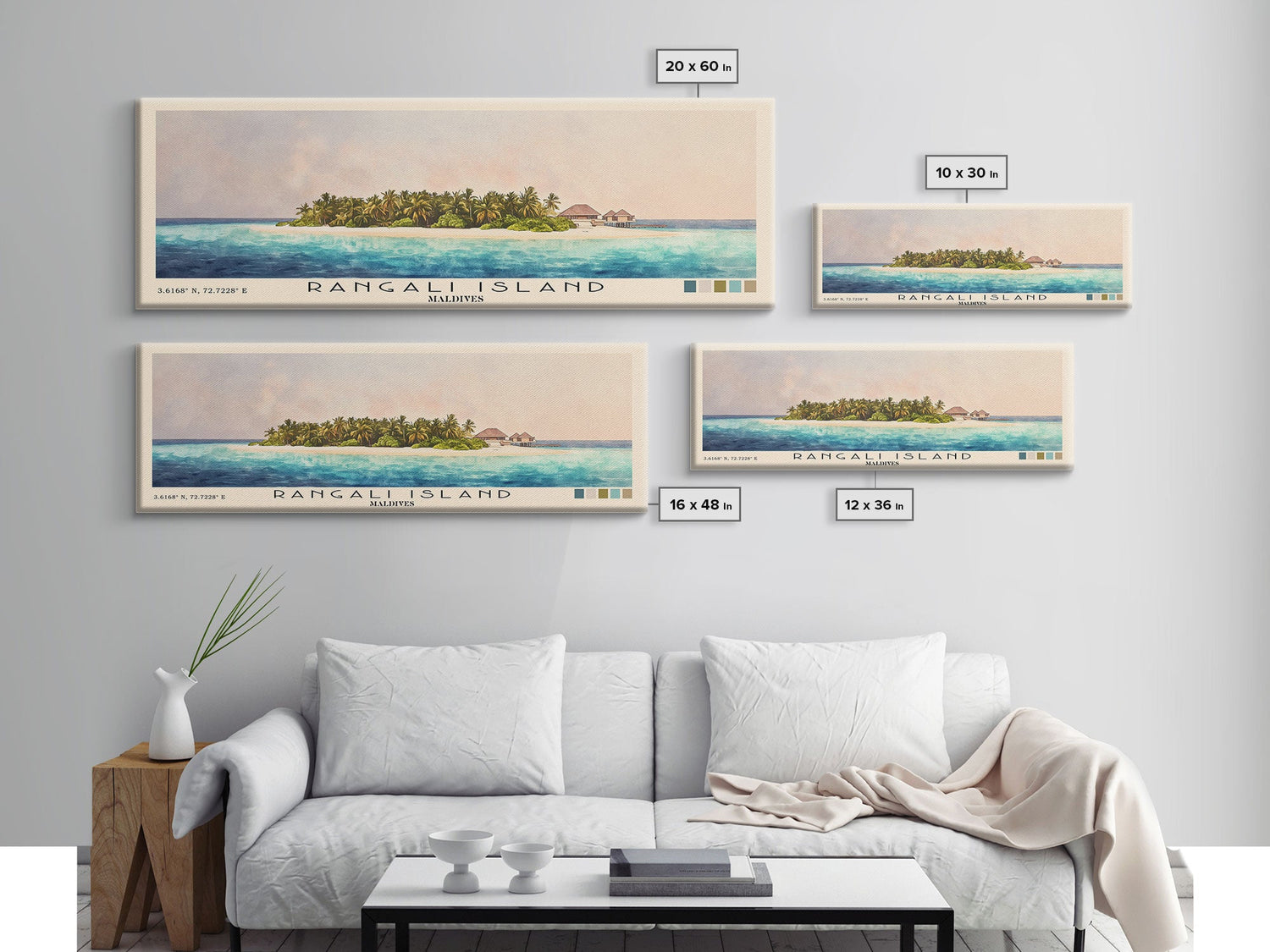 Rangali Island, Maldives Watercolor Beach Print, Vacation Gift, Maldives Wall Art, Framed Canvas Print, Framed Beach Painting - 10x30 Inches / No Frame - Stretched Canvas Only is backordered and will ship as soon as it is back in stock.