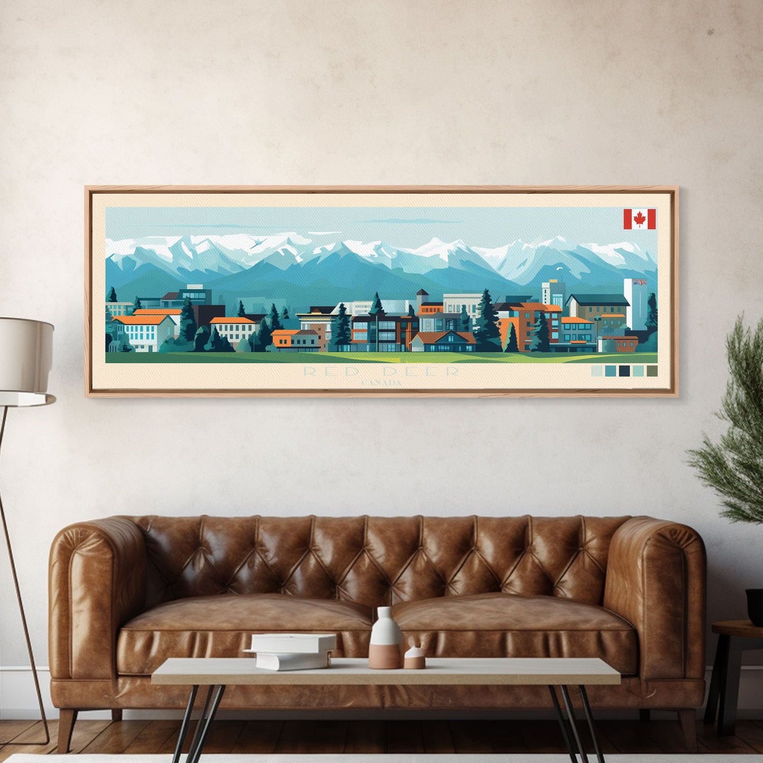 Red Deer, Canada Travel Poster Panoramic Canvas Print, Red Deer, Canada Painting, Canada Art, Red Deer Travel Art, Guest Room Painting