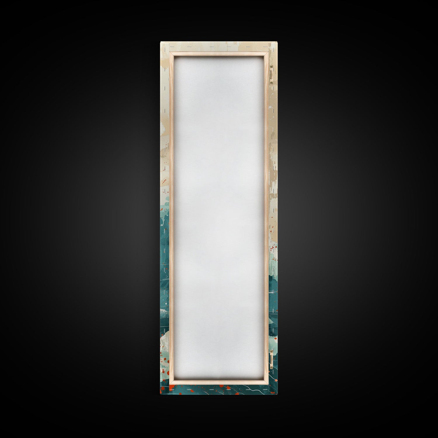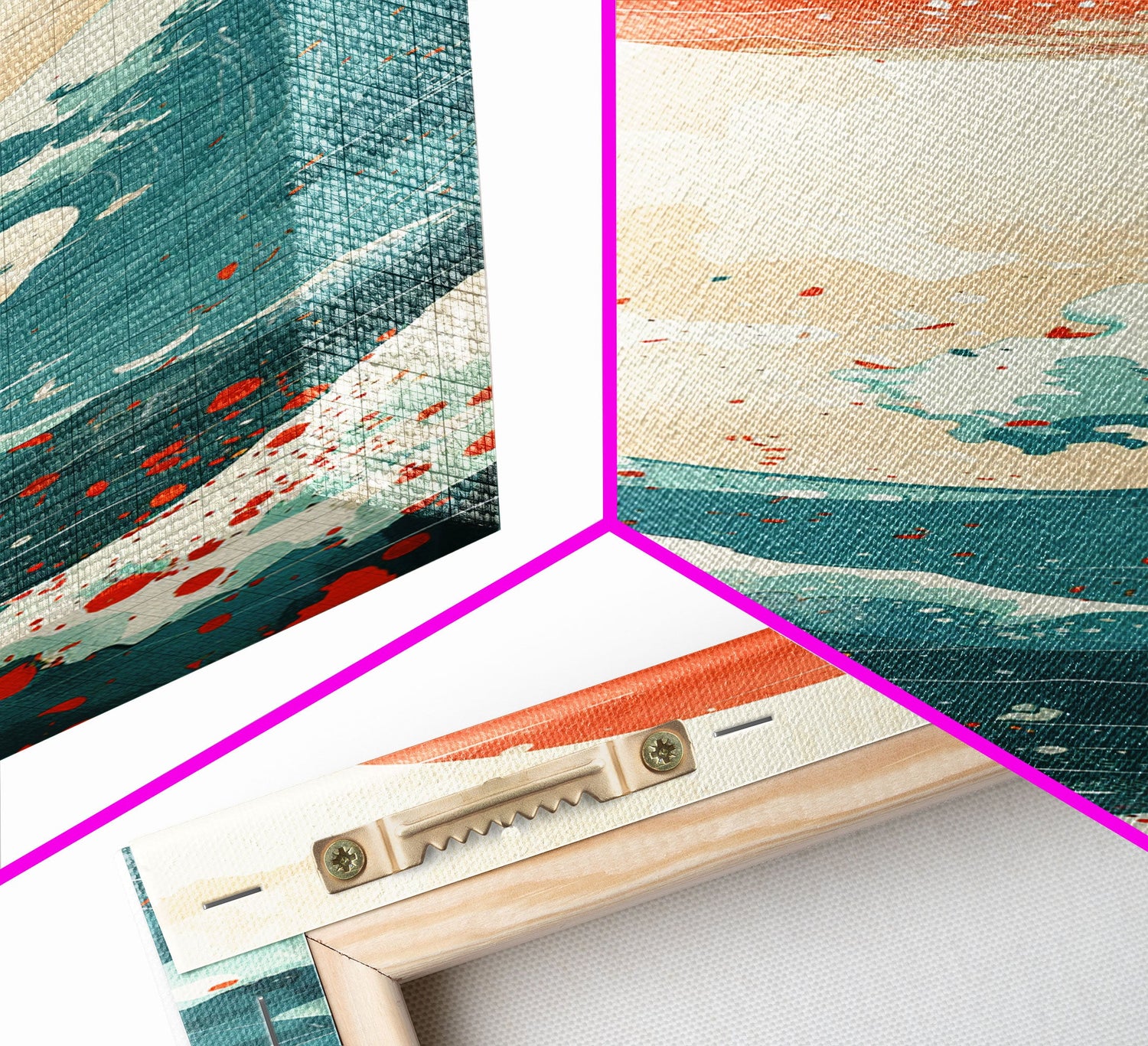 Red Sun and Ocean Waves Skinny Wall Art Framed Canvas Print in Cream and Teal Tones with Red Splashes Japanese Art