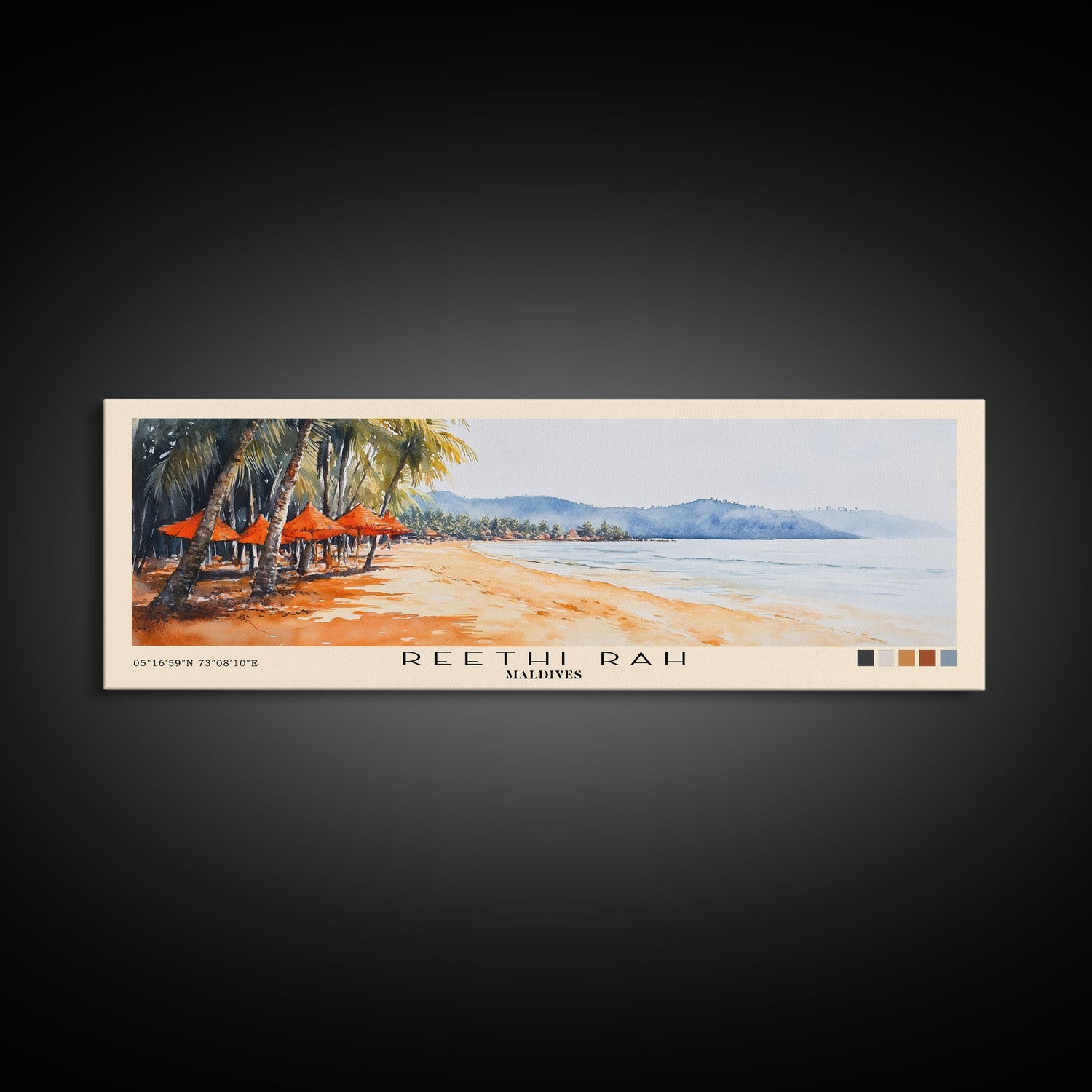 Reethi Rah, Maldives Watercolor Beach Print, Vacation Gift, Maldives Wall Art, Framed Canvas Print, Framed Beach Painting - 10x30 Inches / No Frame - Stretched Canvas Only is backordered and will ship as soon as it is back in stock.