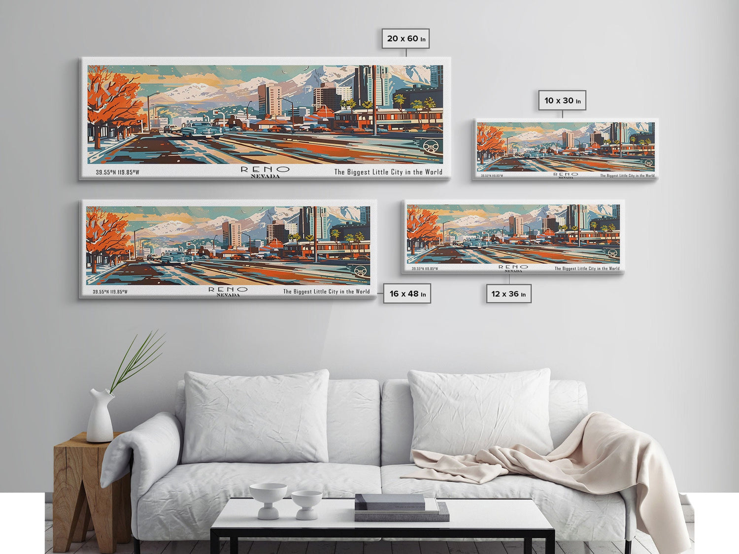Reno Nevada Panoramic Wall Art, Mid Century Modern Framed Canvas Print, Retro Pop Art Travel Poster, Living Room Decor, Office Wall Hanging