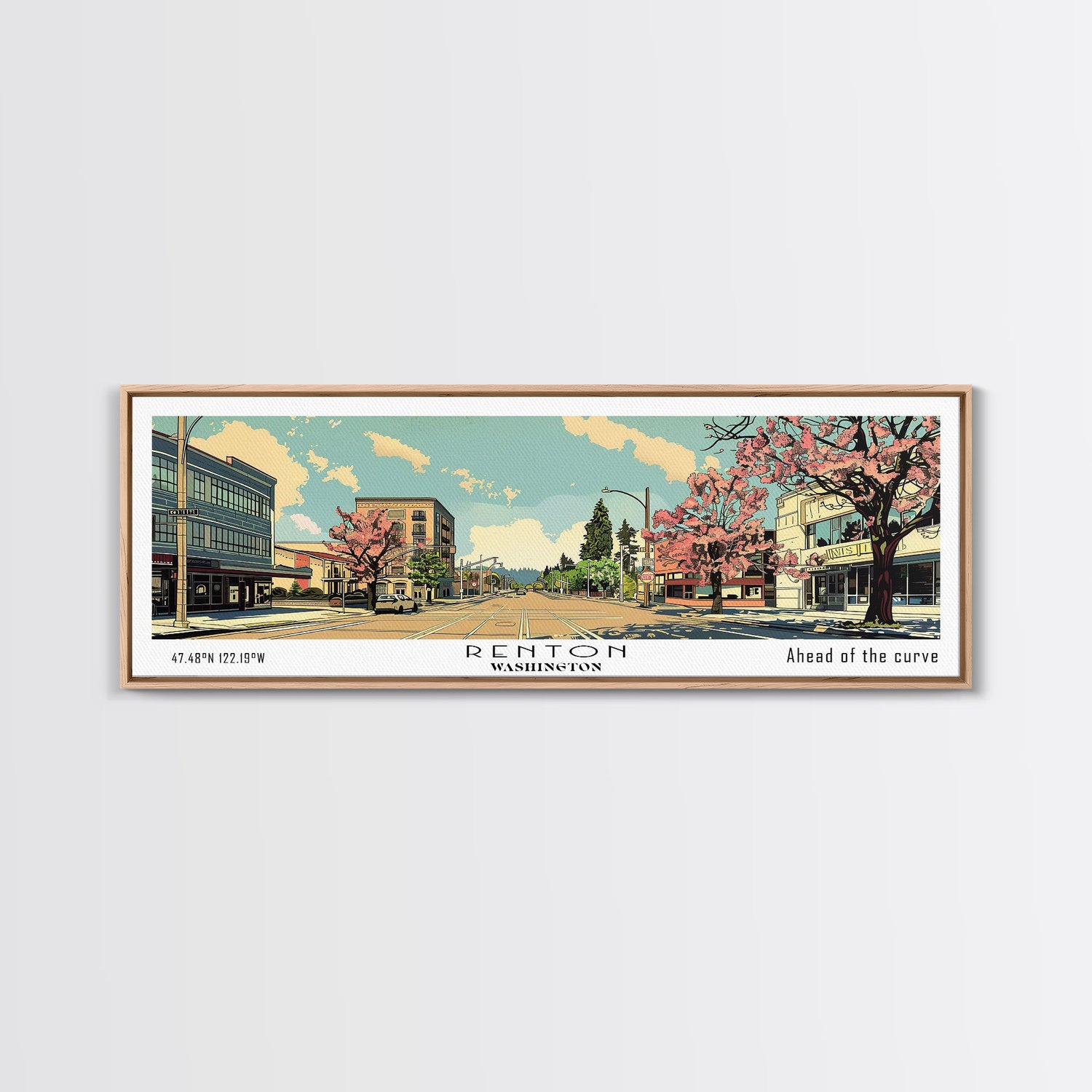Renton Washington Panoramic Wall Art, Mid Century Modern Framed Canvas Print, Retro Pop Art Travel Poster, City Art, Office Wall Decor, Living Room Art