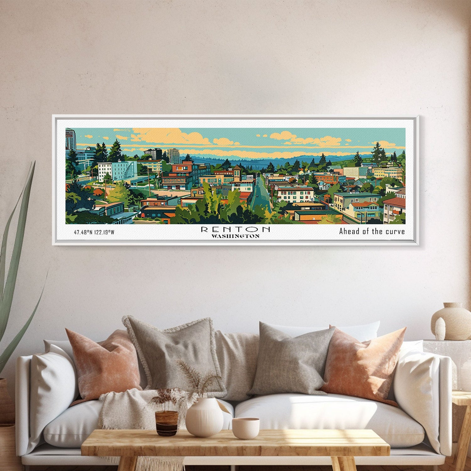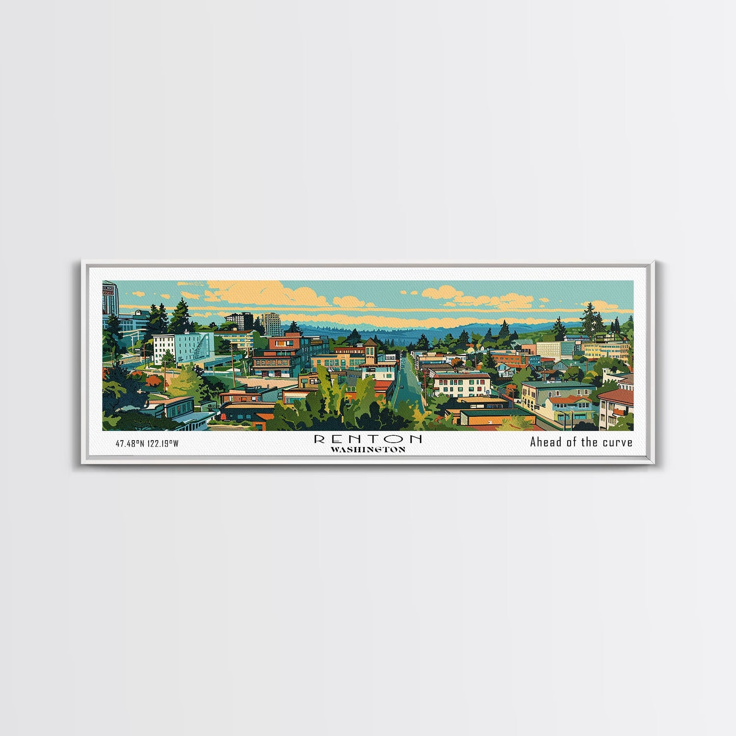 Renton Washington Panoramic Wall Art, Mid Century Modern Framed Canvas Print, Retro Pop Art Travel Poster, City Art, Office Wall Decor, Living Room Art