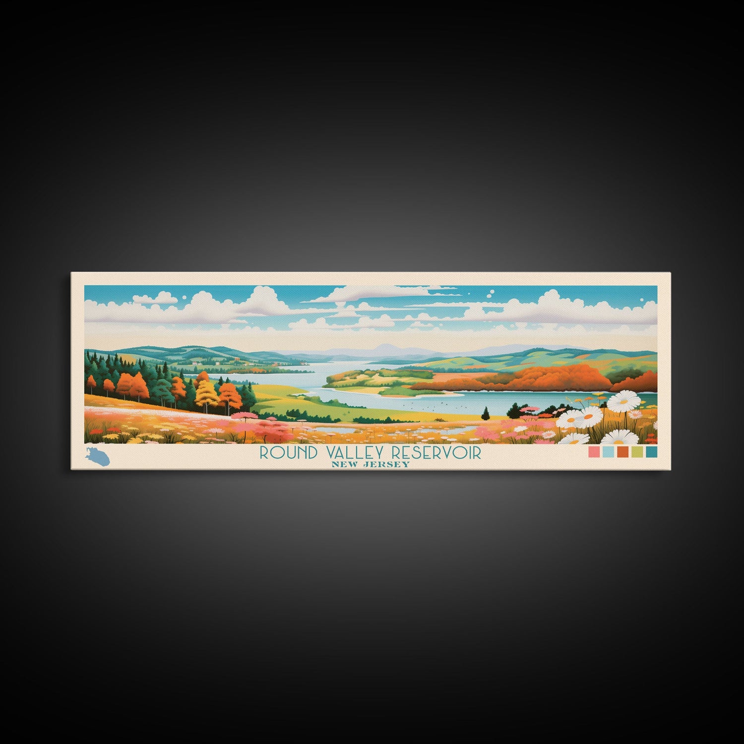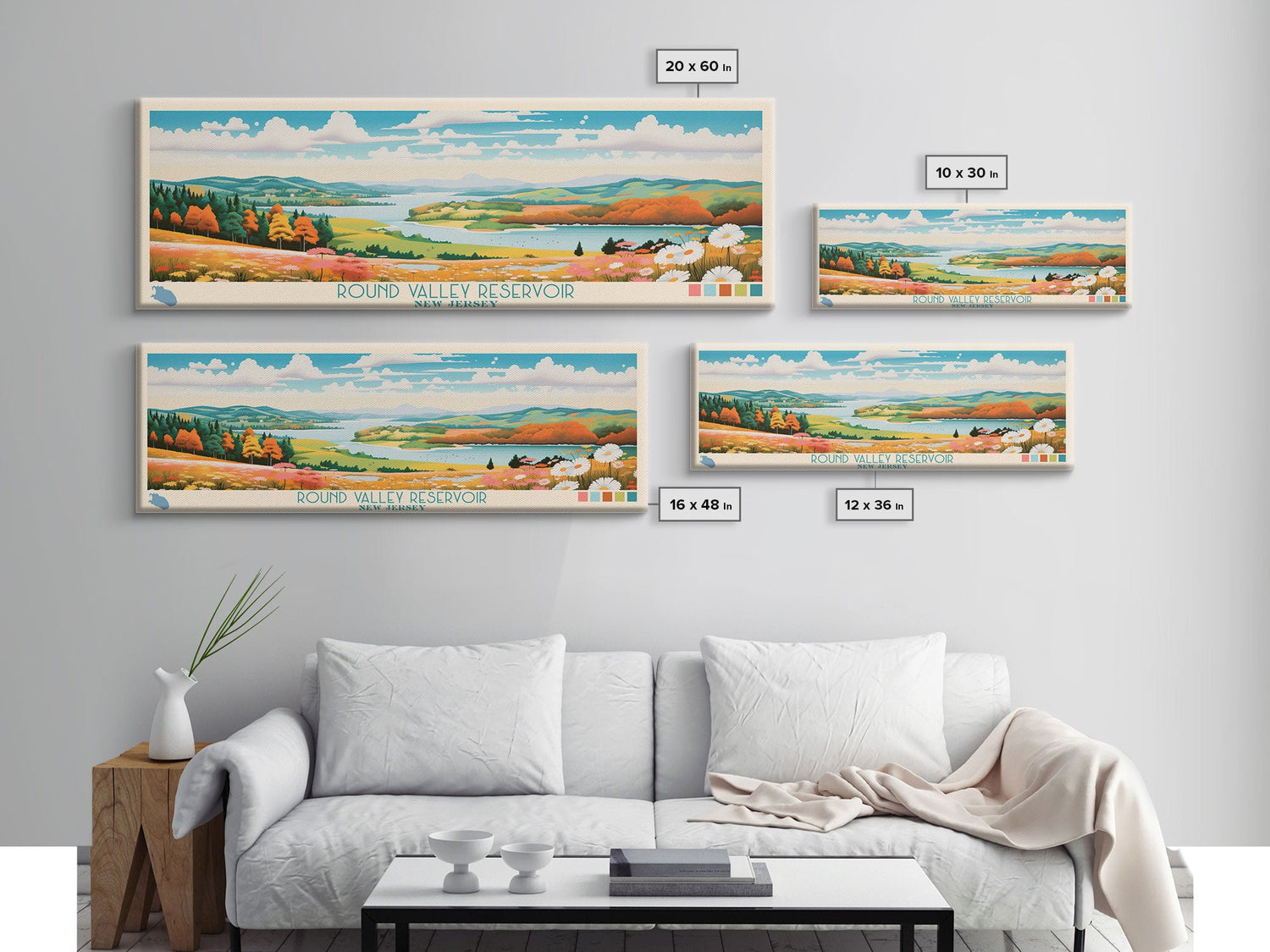 Round Valley Reservoir, New Jersey Framed Canvas Print, Panoramic Travel Poster, Midcentury Modern Art, Home Decor, Pop Art, Wall Decoration - 10x30 Inches / No Frame - Stretched Canvas Only is backordered and will ship as soon as it is back in stock.