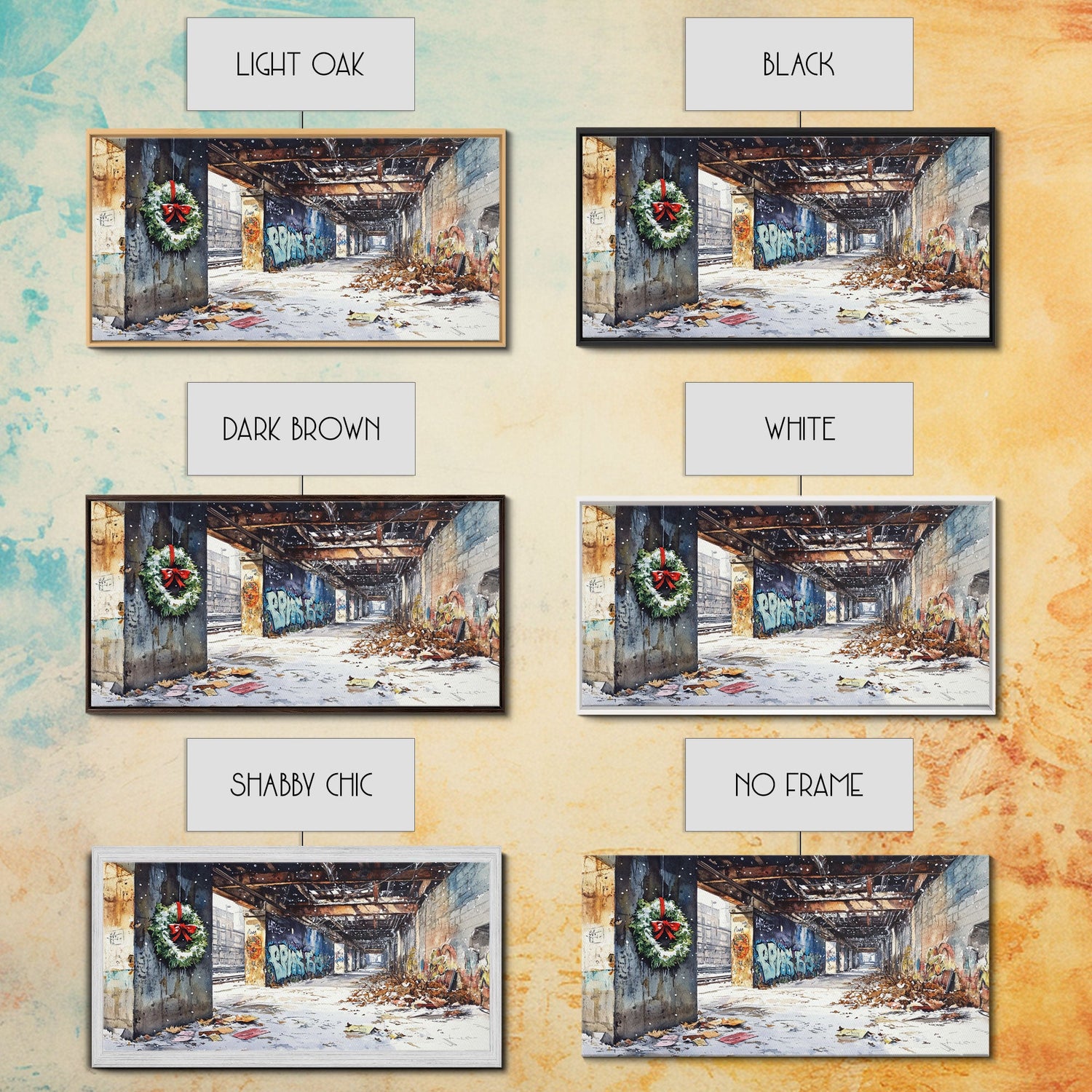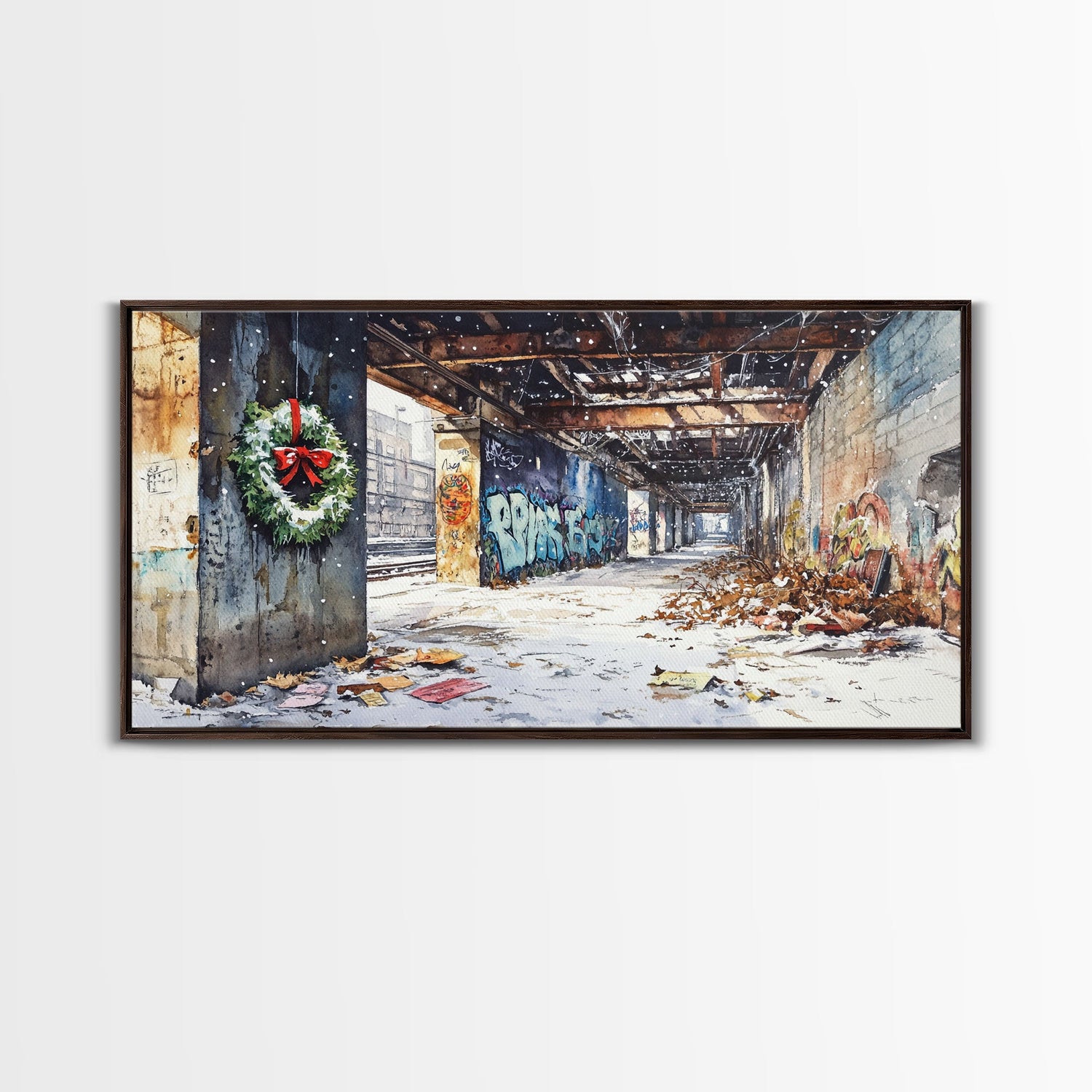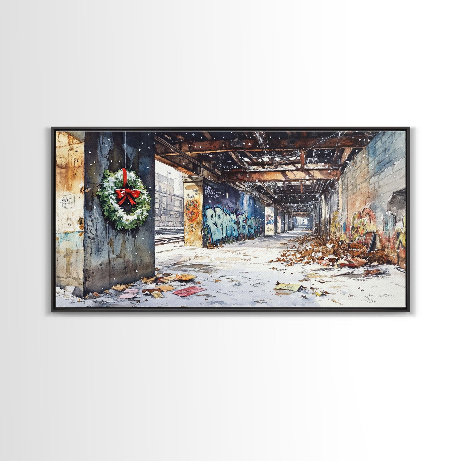 Rustic Urban Wreath Holiday Decor Framed Canvas Print, Christmas Scene with Snowfall and Graffiti Wall Perfect Holiday Wall Art - 10x20 Inches / No Frame - Stretched Canvas Only is backordered and will ship as soon as it is back in stock.