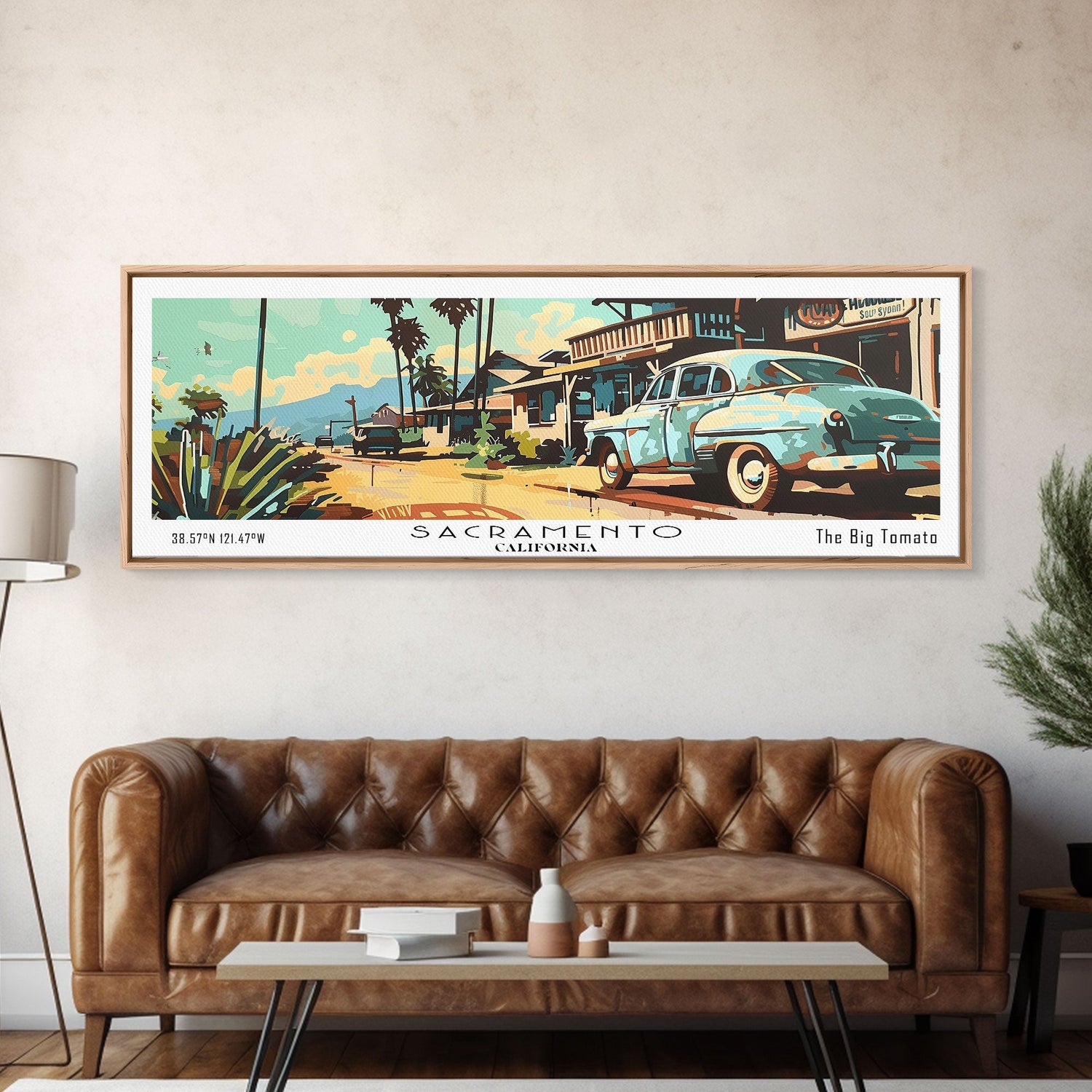 Sacramento California Panoramic Painting, Mid Century Modern Framed Canvas Print, Retro Pop Art Travel Poster, Living Room and Office Wall Art