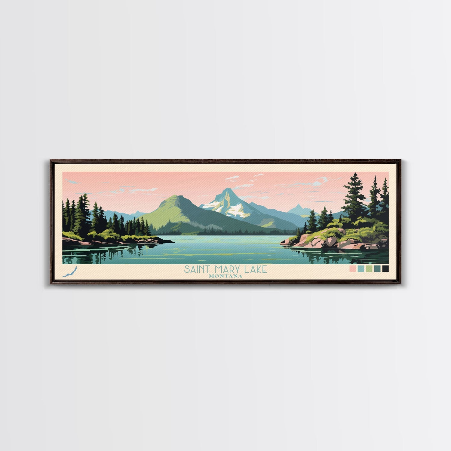 Saint Mary Lake, Montana Framed Canvas Print, Panoramic Travel Poster, Midcentury Modern Art, Bedroom Decor, Pop Art, Wall Art - 10x30 Inches / No Frame - Stretched Canvas Only is backordered and will ship as soon as it is back in stock.