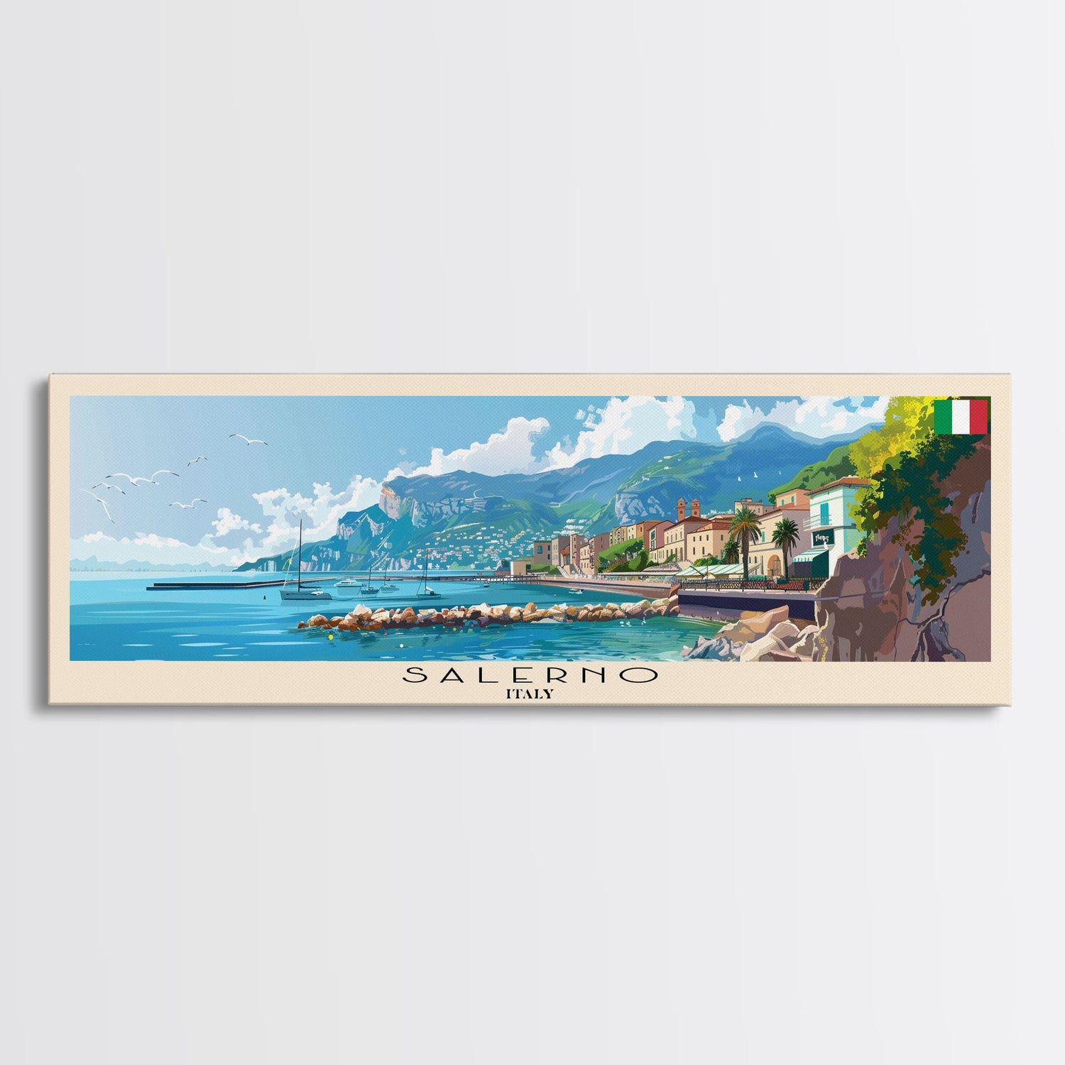 Salerno Italy Travel Art, City Art, Framed Canvas Print or Metal Wall Art, Europe Travel Poster, Panoramic Wall Art, Extra Wide Wall Art