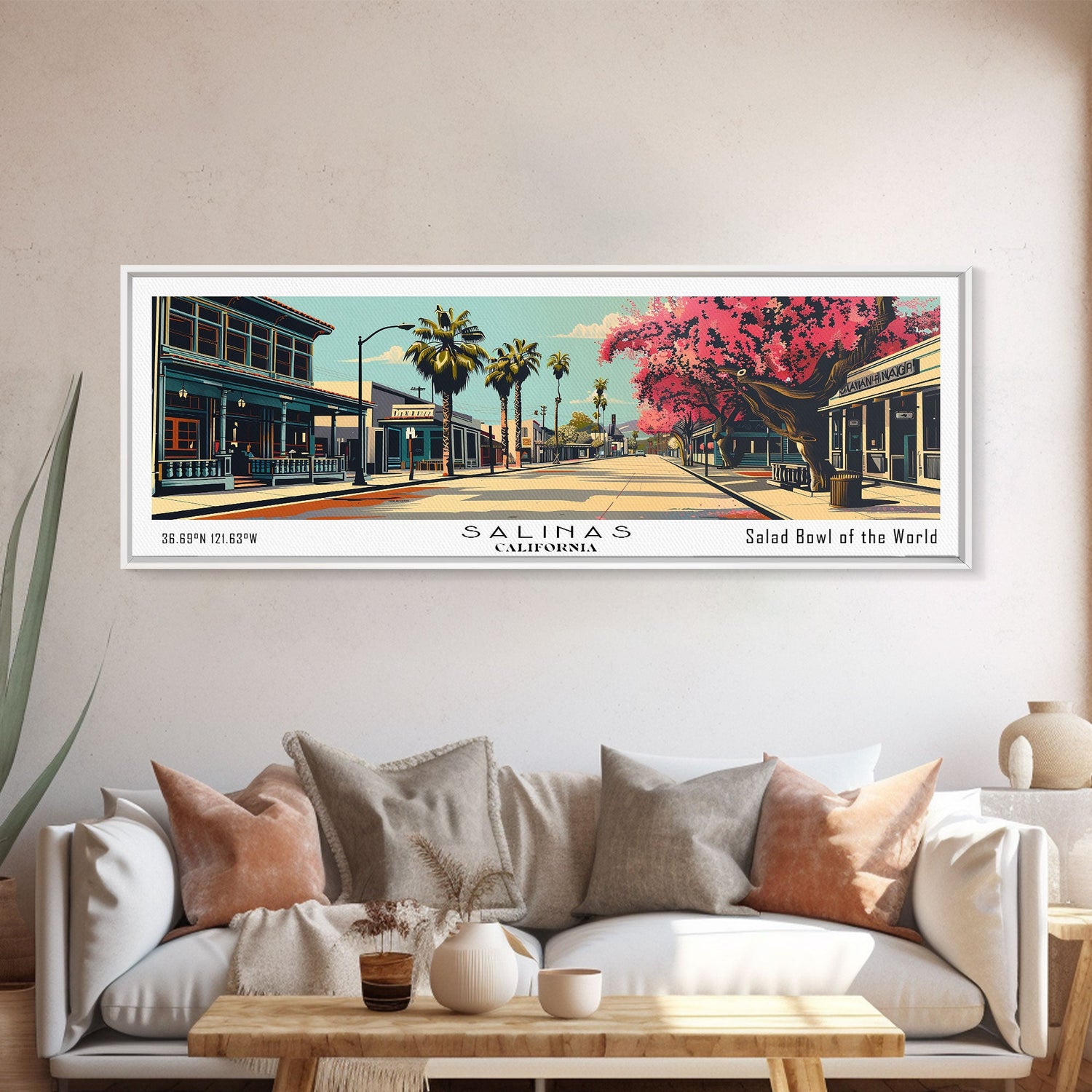 Salinas California Panoramic Painting, Mid Century Modern Framed Canvas Print, Retro Pop Art Travel Poster, Cityscape, Home Decor, Office Wall Art