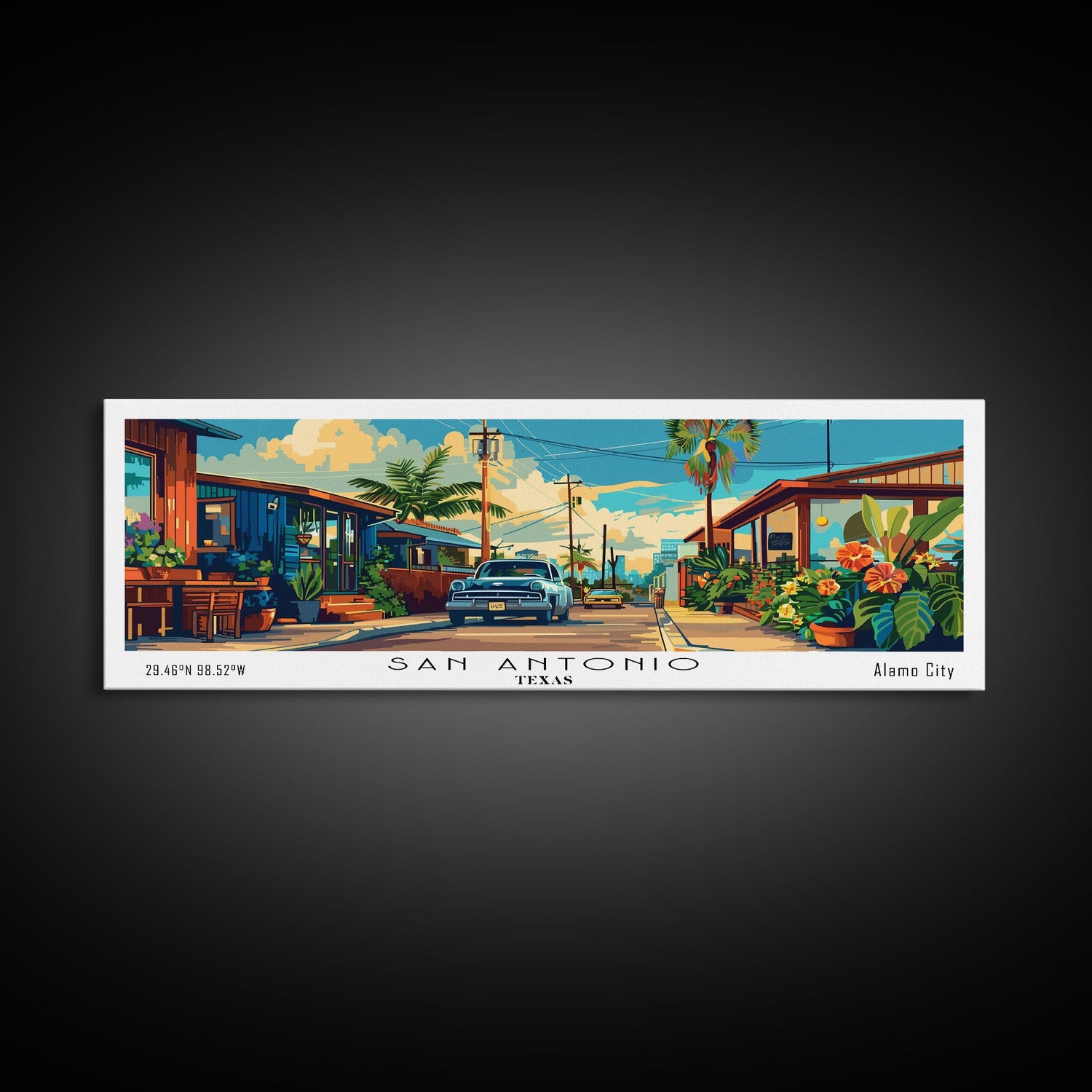 San Antonio Texas Panoramic Wall Art, Mid Century Modern Framed Canvas Print, Retro Pop Art Travel Poster, Home Decor