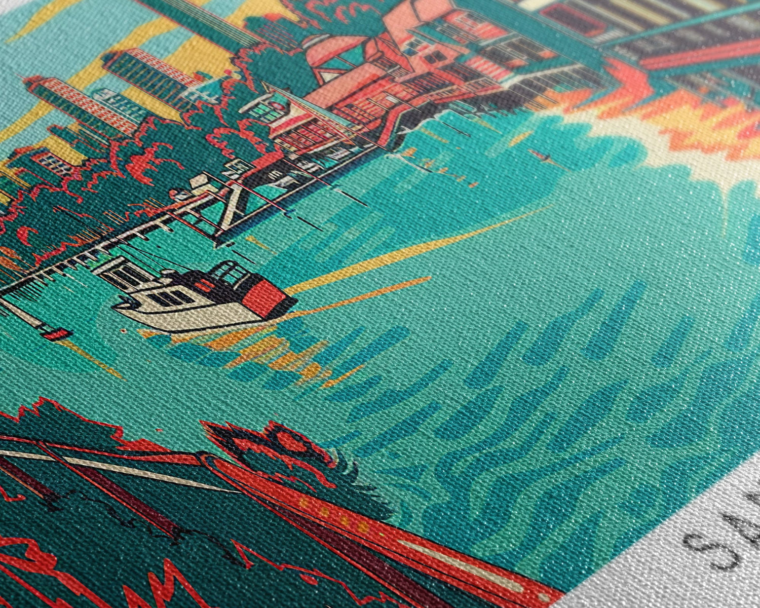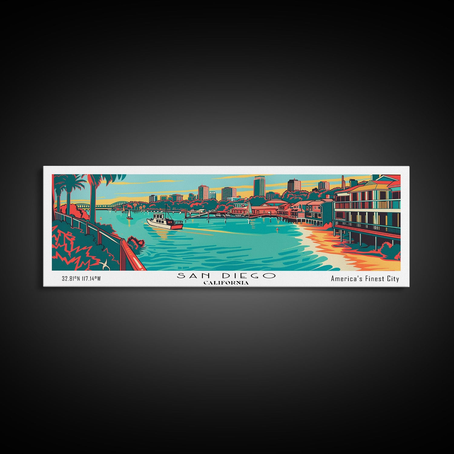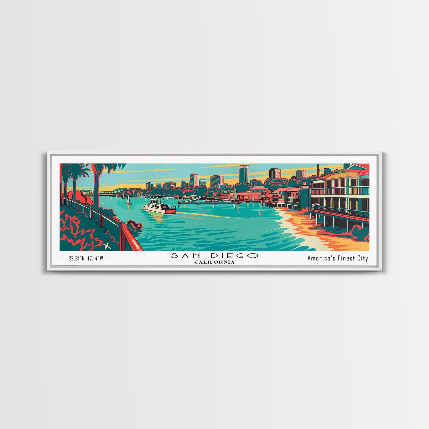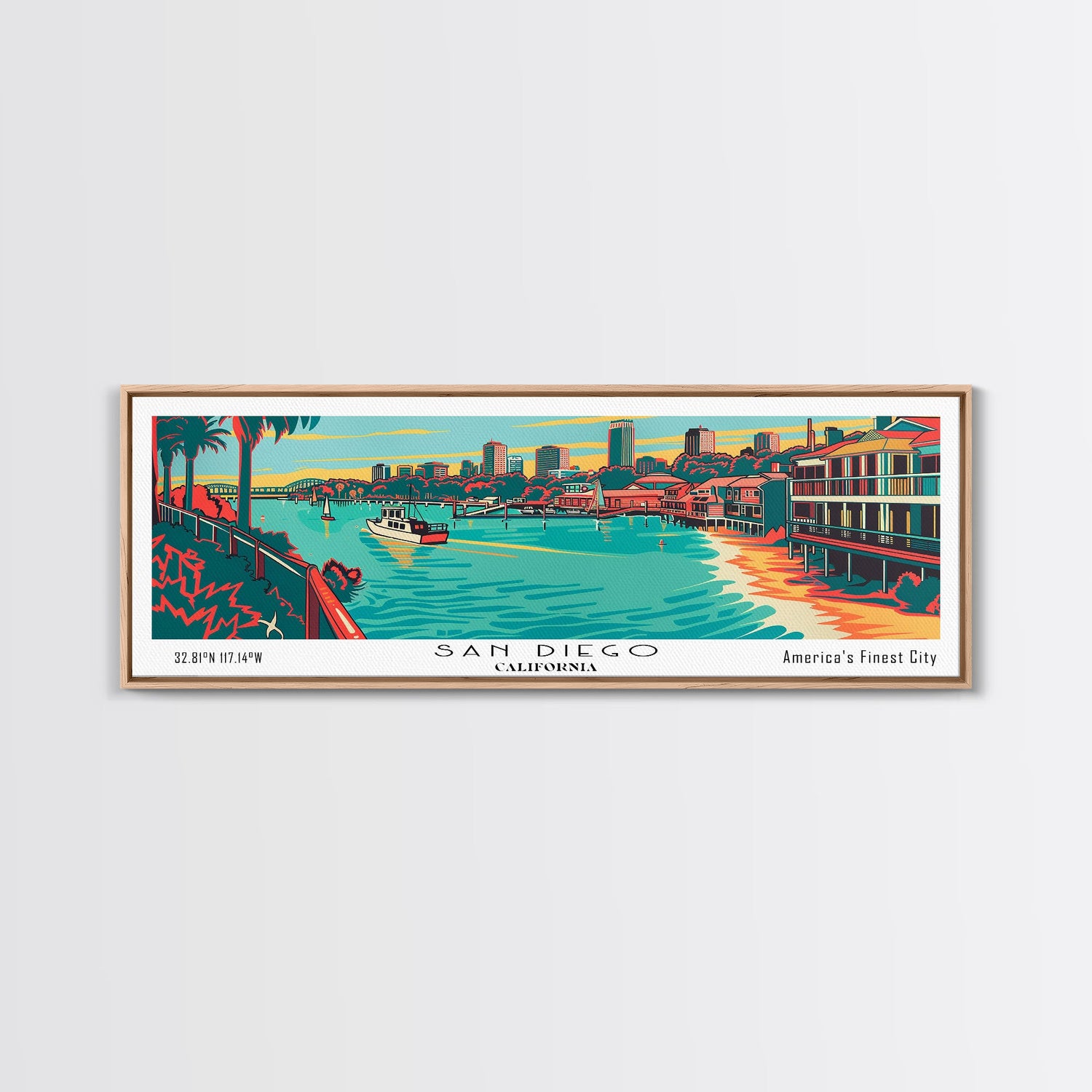 San Diego California Panoramic Painting Framed Canvas Print, Travel Poster, Mid Century Modern Art, Pop Art Style, Wall Decor, Living Room Art