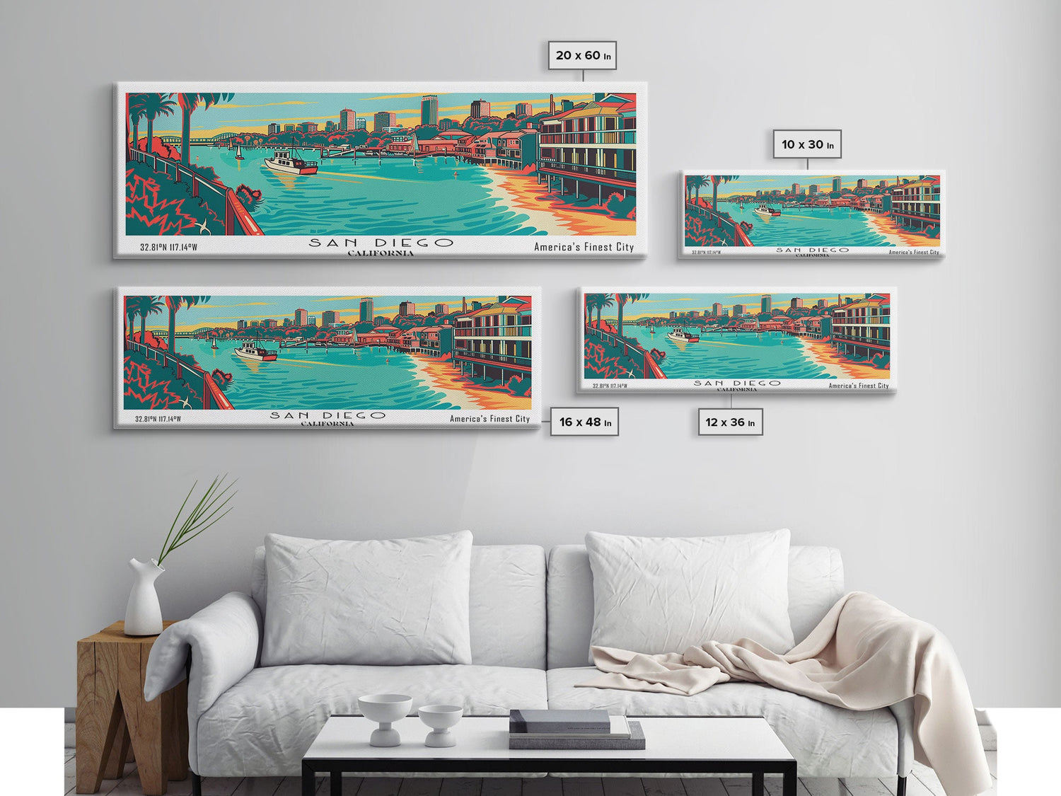 San Diego California Panoramic Painting Framed Canvas Print, Travel Poster, Mid Century Modern Art, Pop Art Style, Wall Decor, Living Room Art - 10x30 Inches / No Frame - Stretched Canvas Only is backordered and will ship as soon as it is back in stock.
