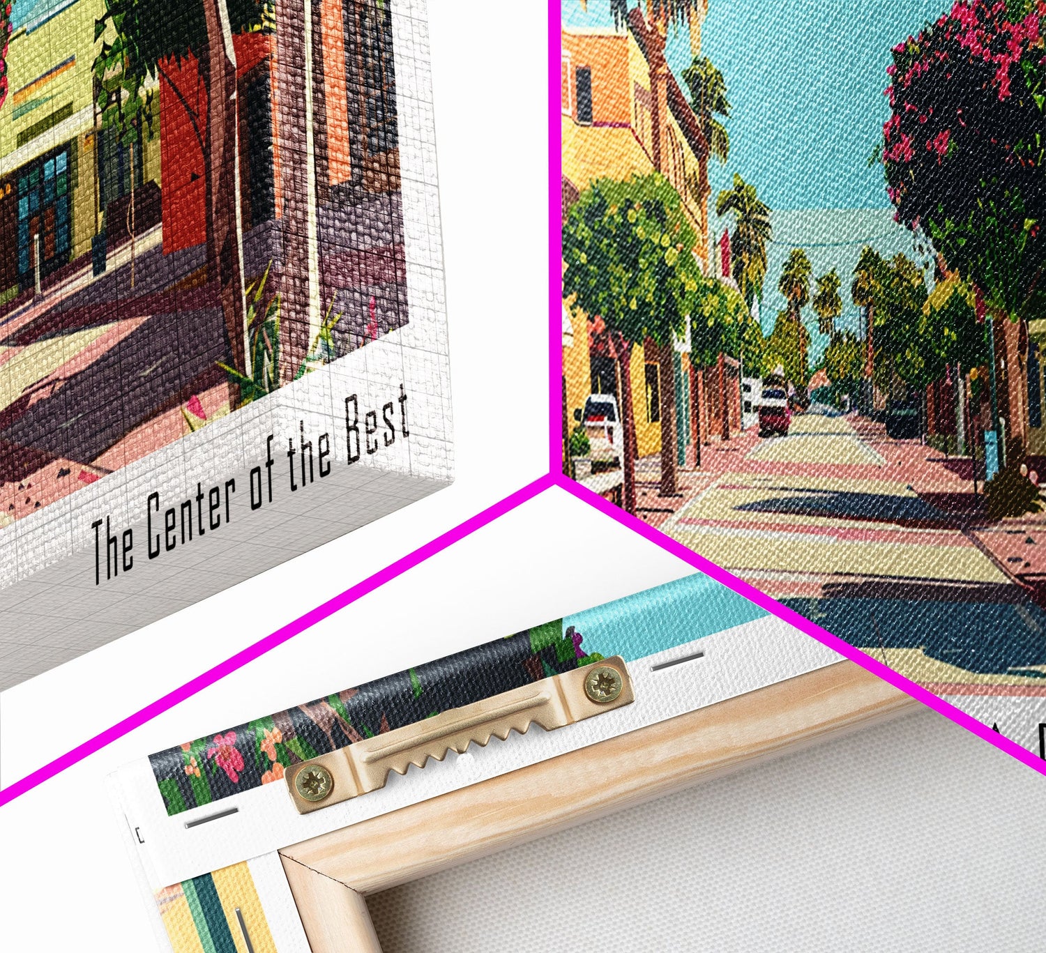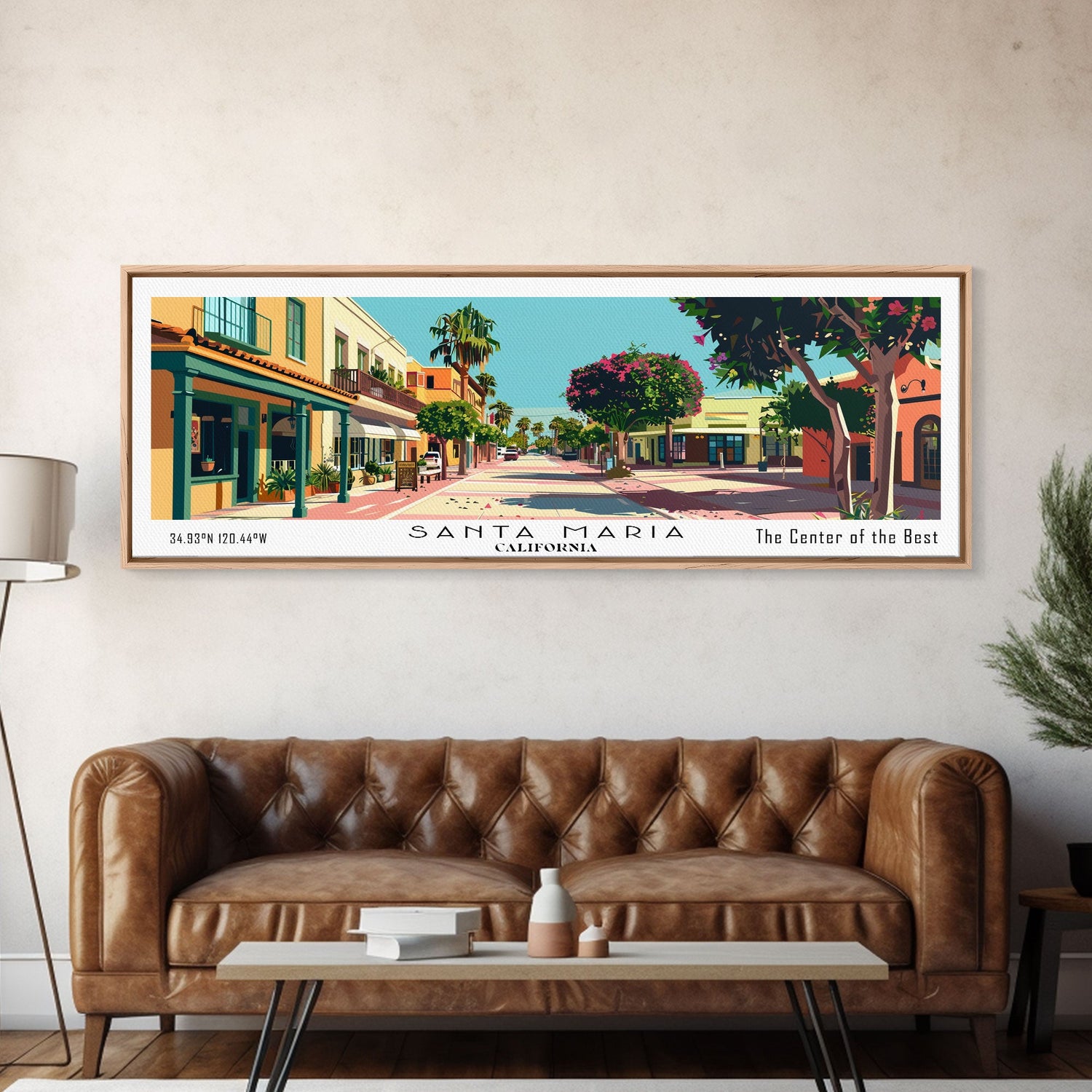 Santa Maria California Panoramic Painting, Mid Century Modern Framed Canvas Print, Retro Pop Art Travel Poster, Home and Office Wall Art Decor