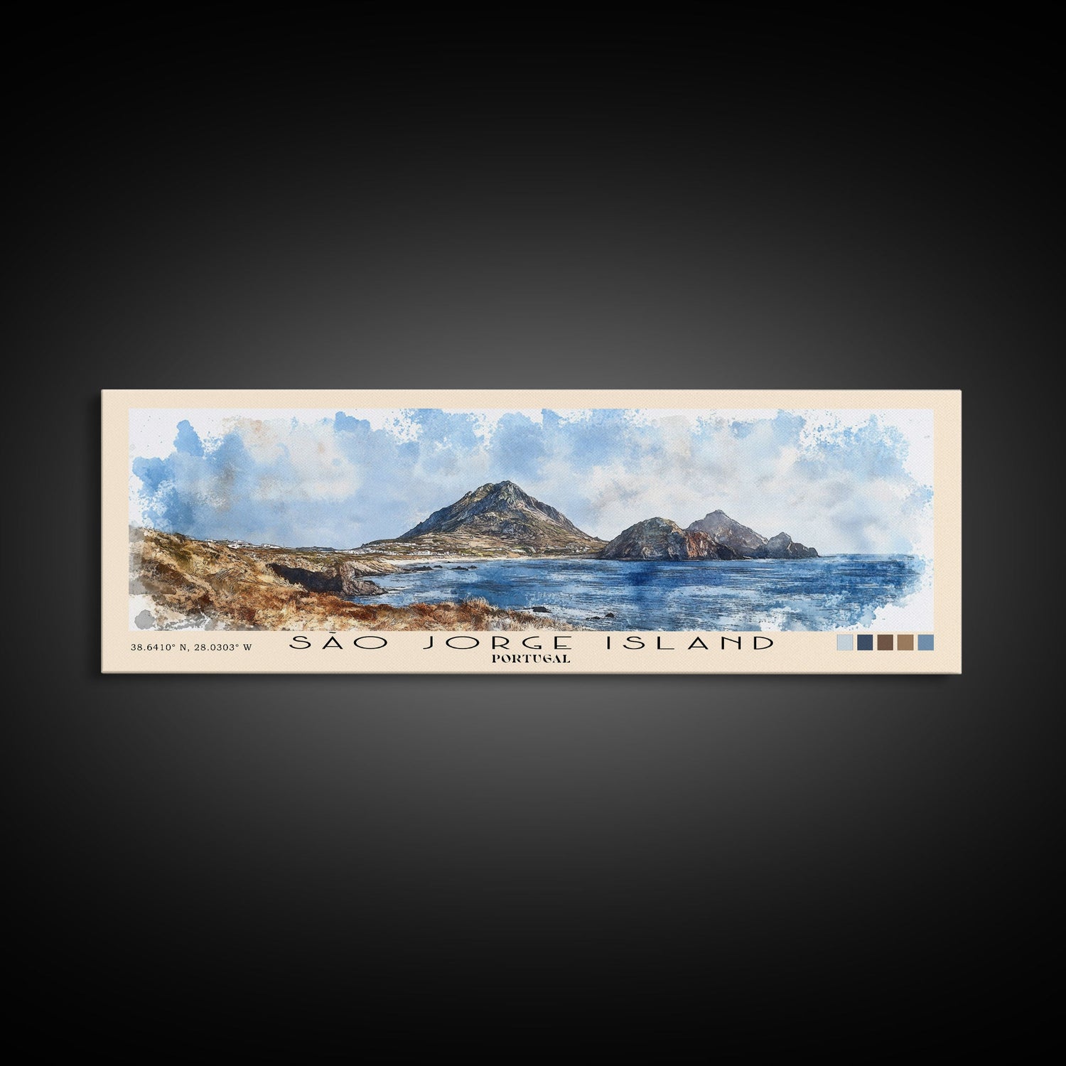 São Jorge Island, Portugal Watercolor Beach Print, Vacation Gift, Portugal Wall Art, Framed Canvas Print, Framed Beach Painting - 10x30 Inches / No Frame - Stretched Canvas Only is backordered and will ship as soon as it is back in stock.
