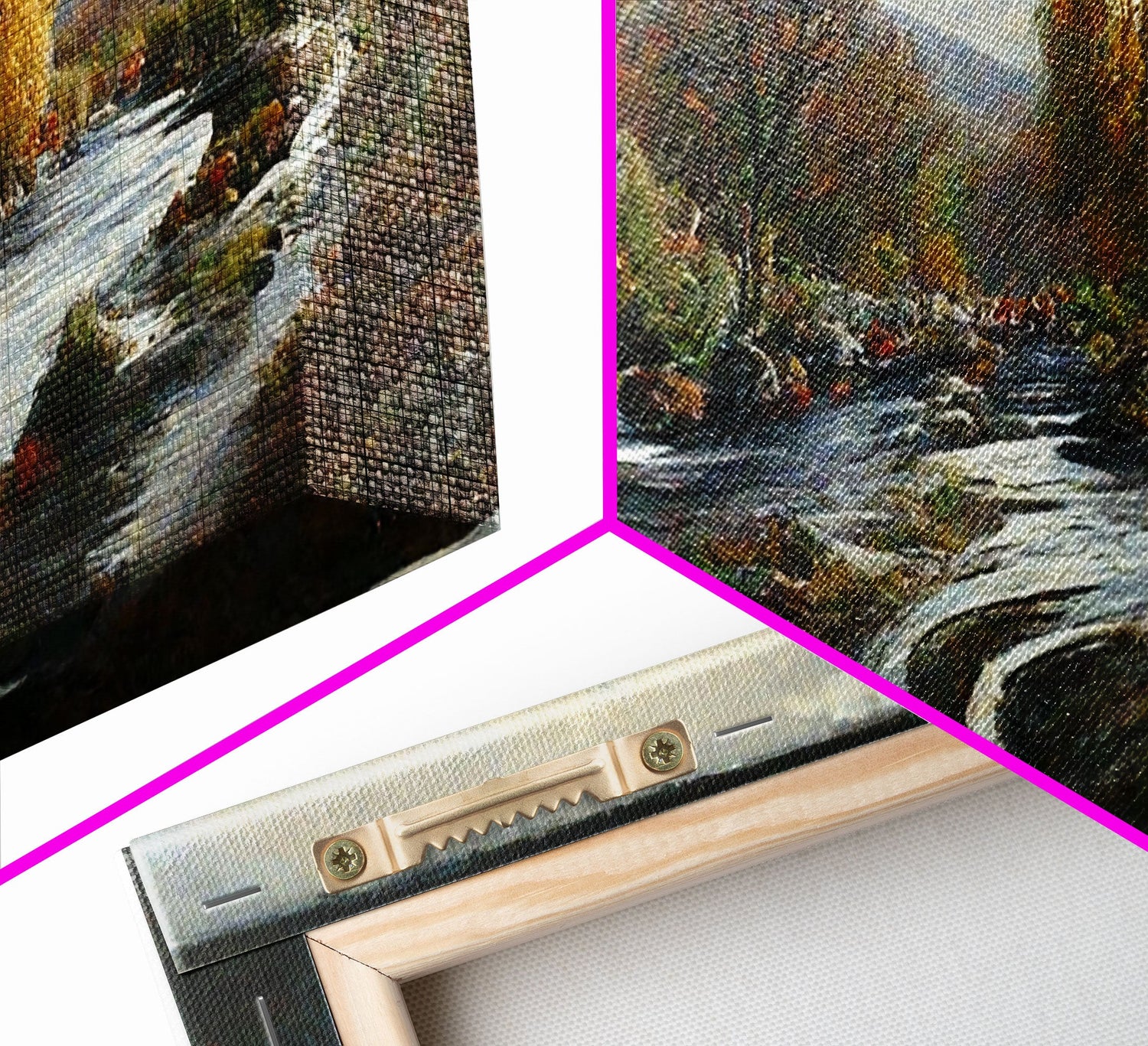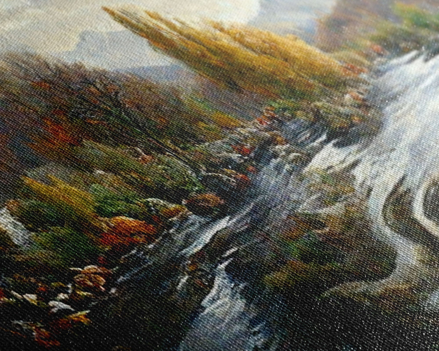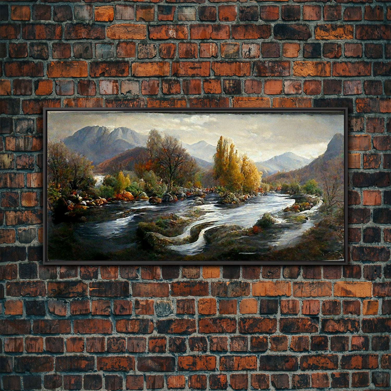 Scenic nature landscape canvas print, flowing river water color, fall scenic art, panoramic nature landscape