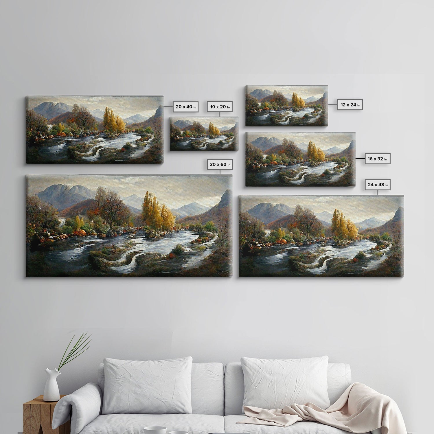 Scenic nature landscape canvas print, flowing river water color, fall scenic art, panoramic nature landscape - 10x20 Inches / No Frame - Stretched Canvas Only is backordered and will ship as soon as it is back in stock.