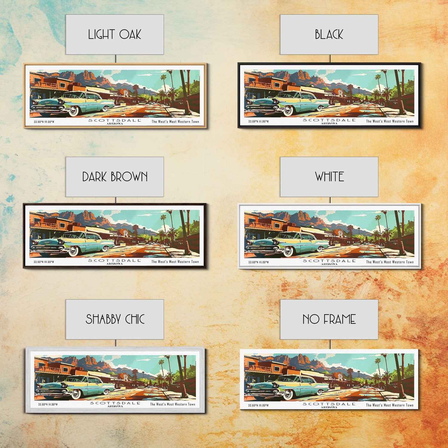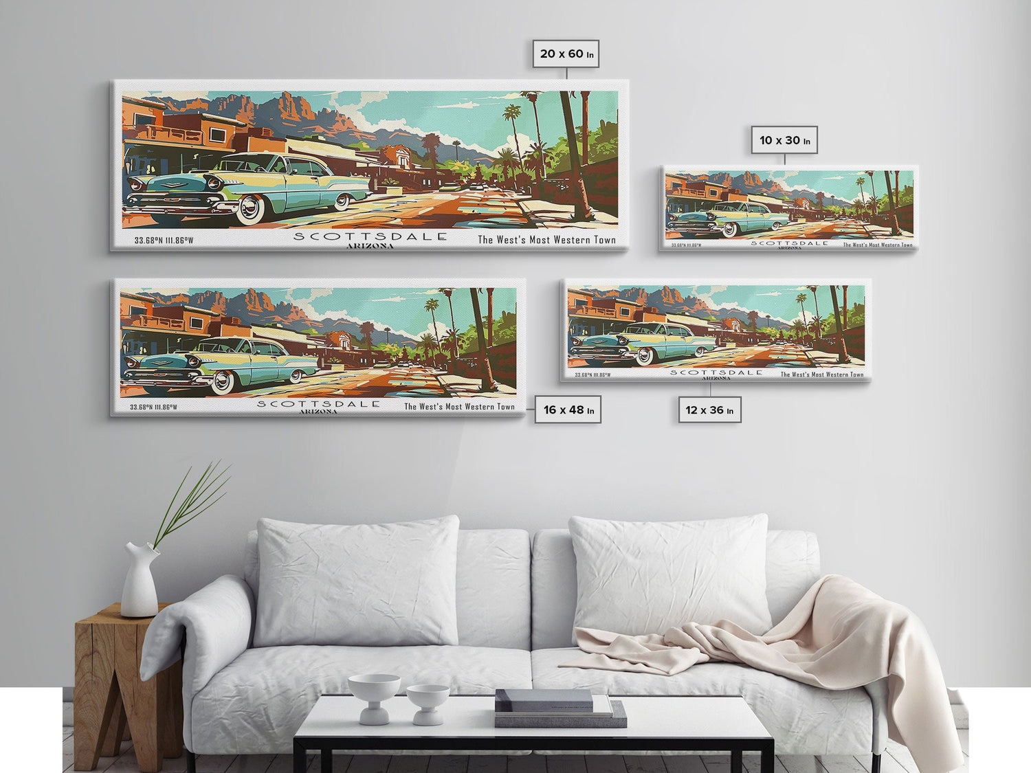 Scottsdale Arizona Panoramic Painting, Mid Century Modern Framed Canvas Print, Retro Pop Art Travel Poster, Living Room and Office Wall Art