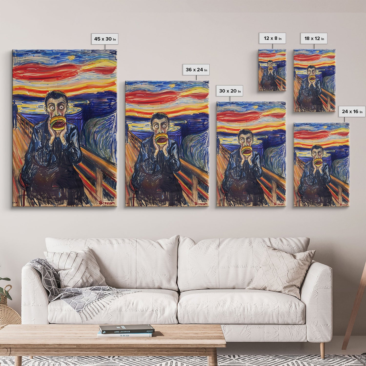 Scream-Inspired Art of a Man Eating a Hamburger, Blending Horror and Humor for a Unique Halloween Wall Art Addition - 8x12 Inches / No Frame - Stretched Canvas Only is backordered and will ship as soon as it is back in stock.