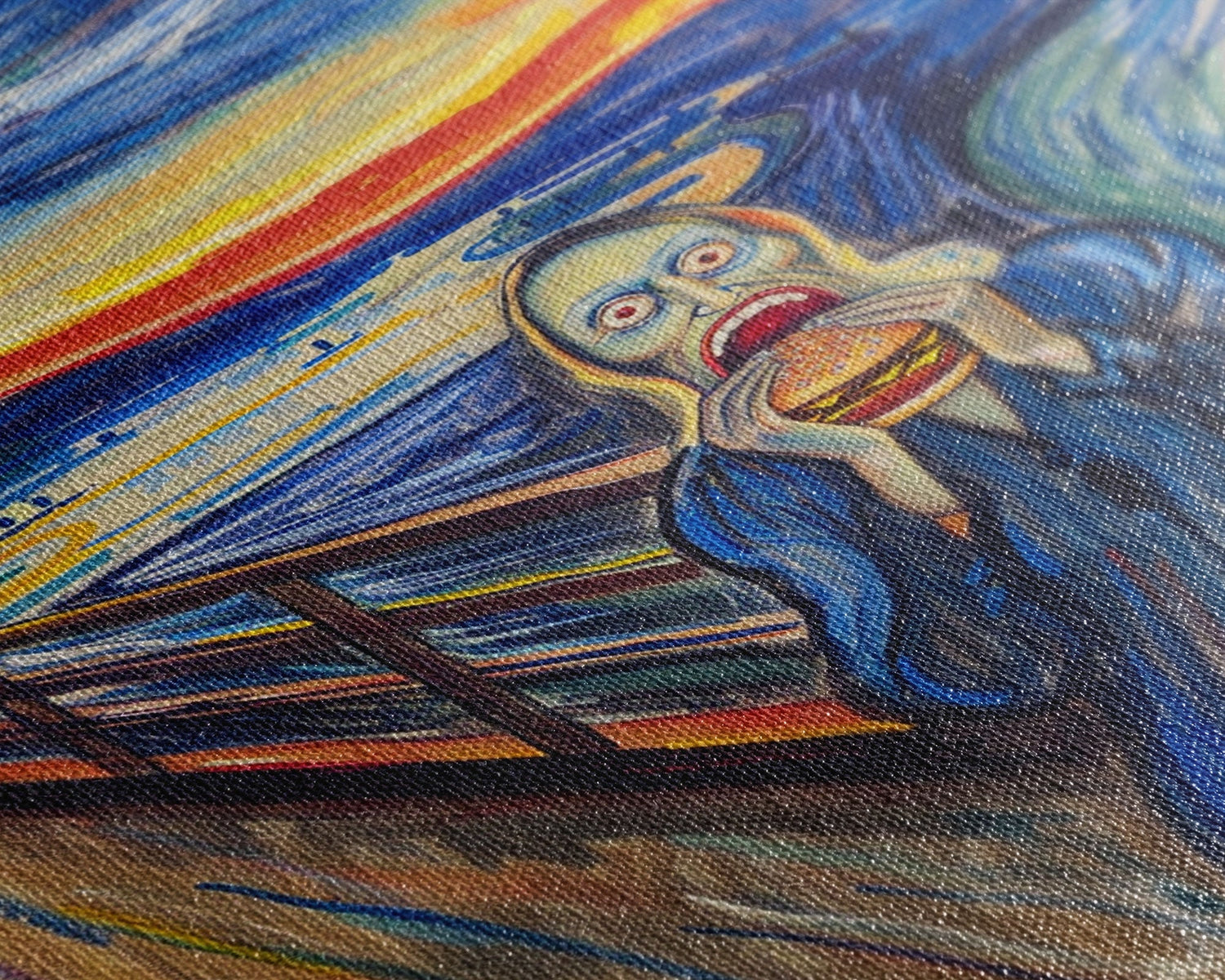 Scream-Inspired Halloween Art with a Figure Eating a Hamburger, Combining Horror and Humor for a Unique and Spooky Wall Art Piece