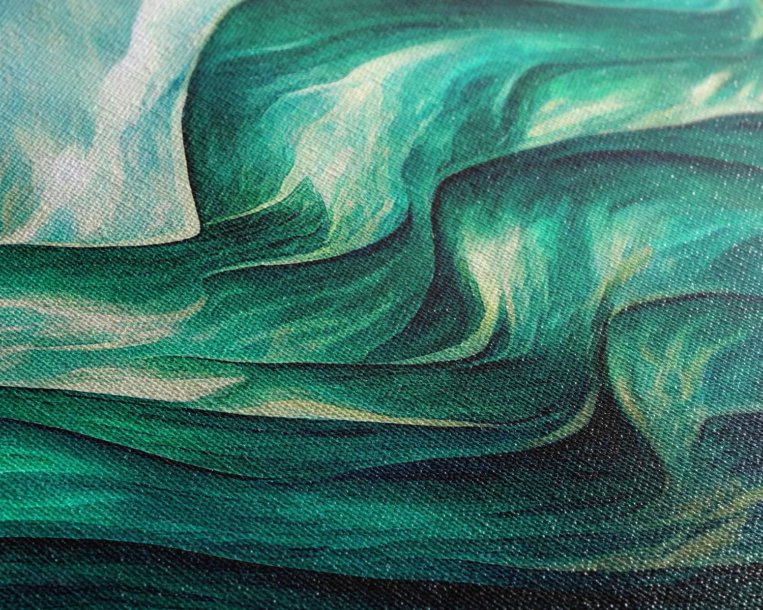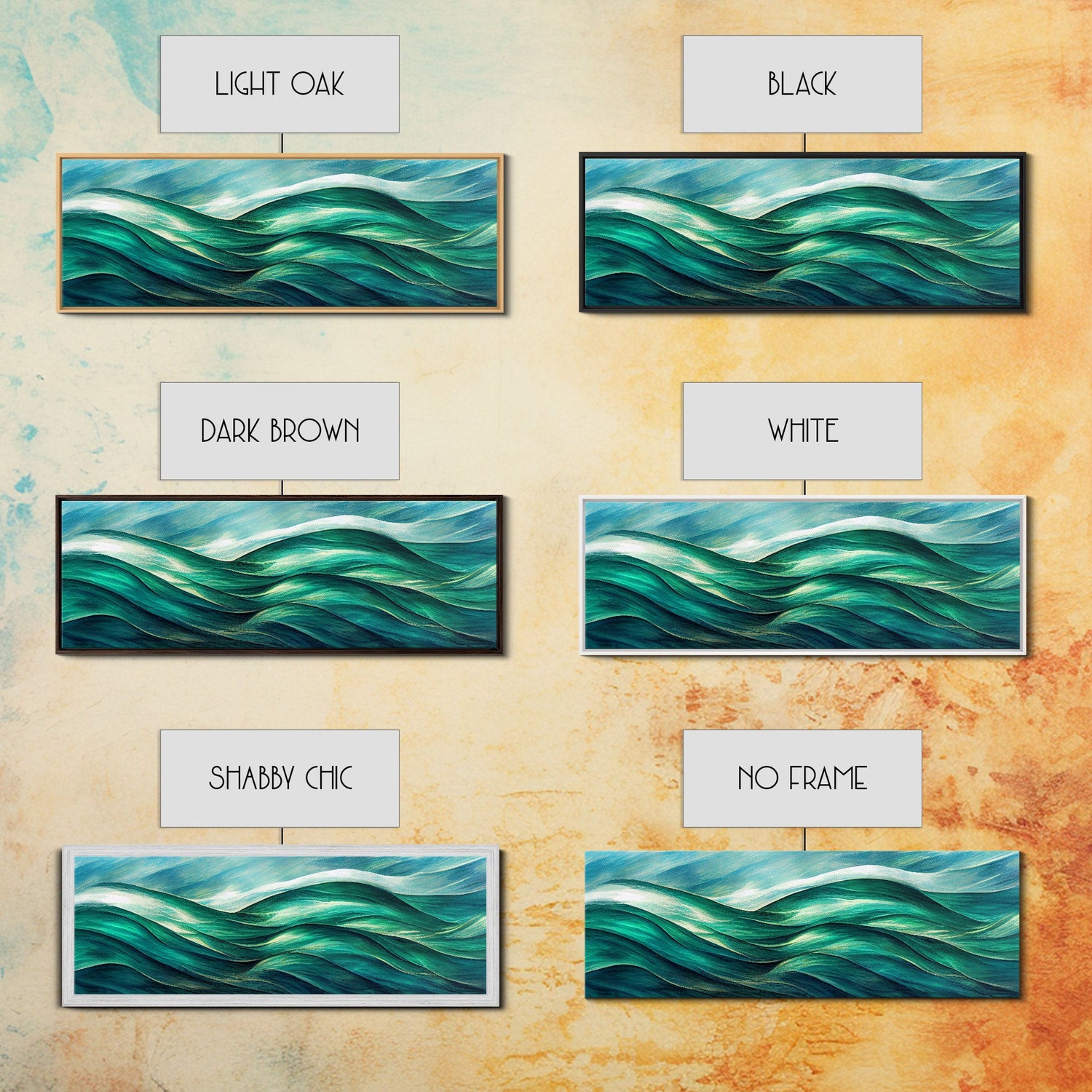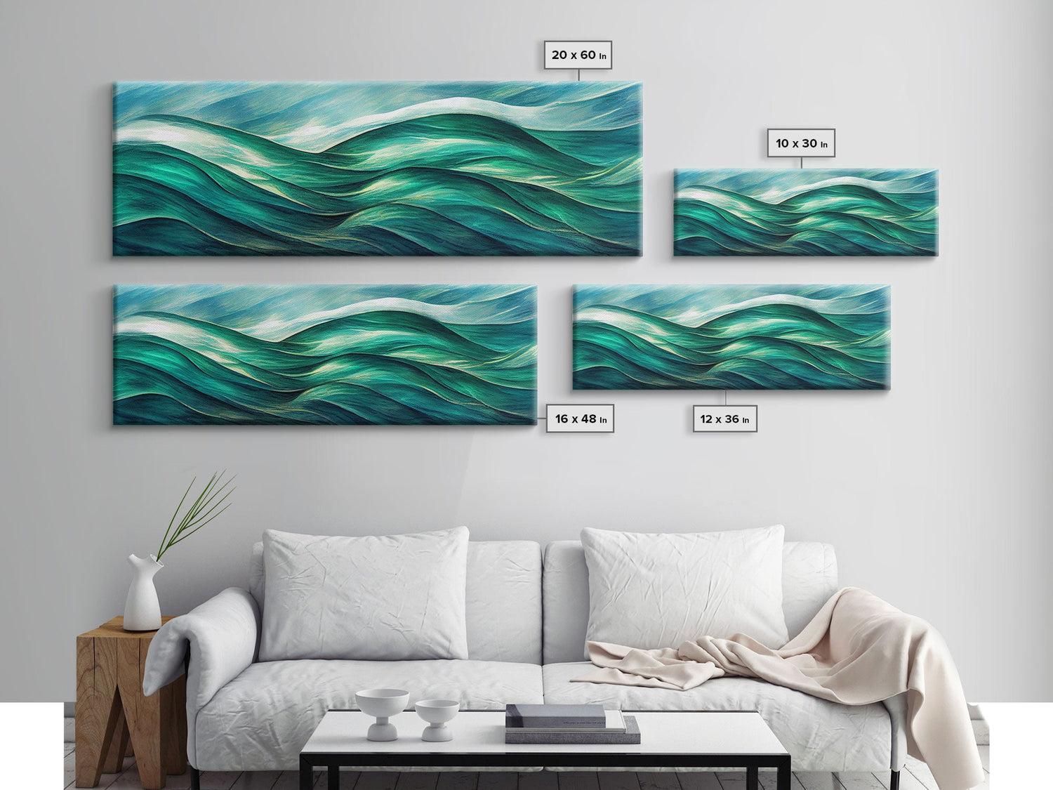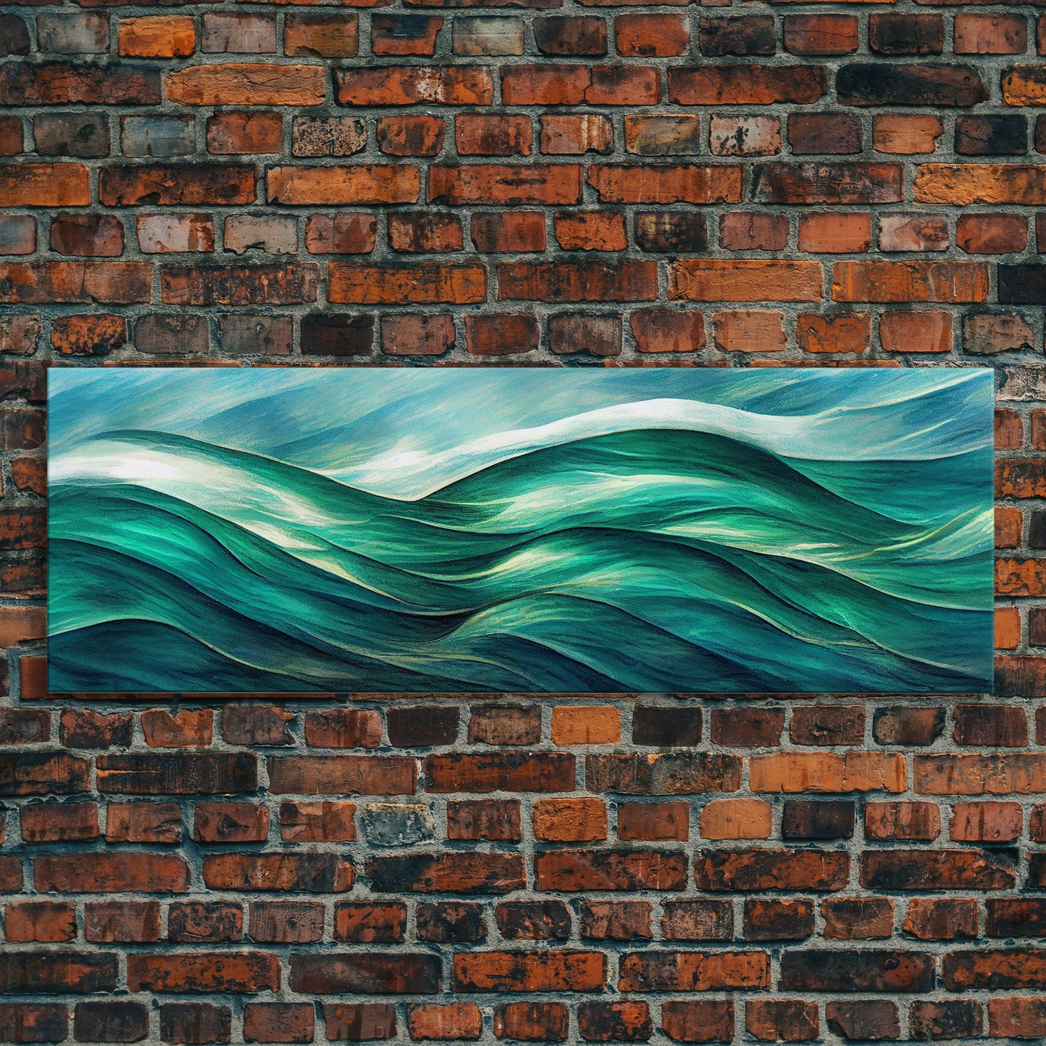 Sea Green Ocean Waves, Ready To Hang Canvas Print, Panoramic Art Deco Style Wall Decor, Emerald Green Wall Art