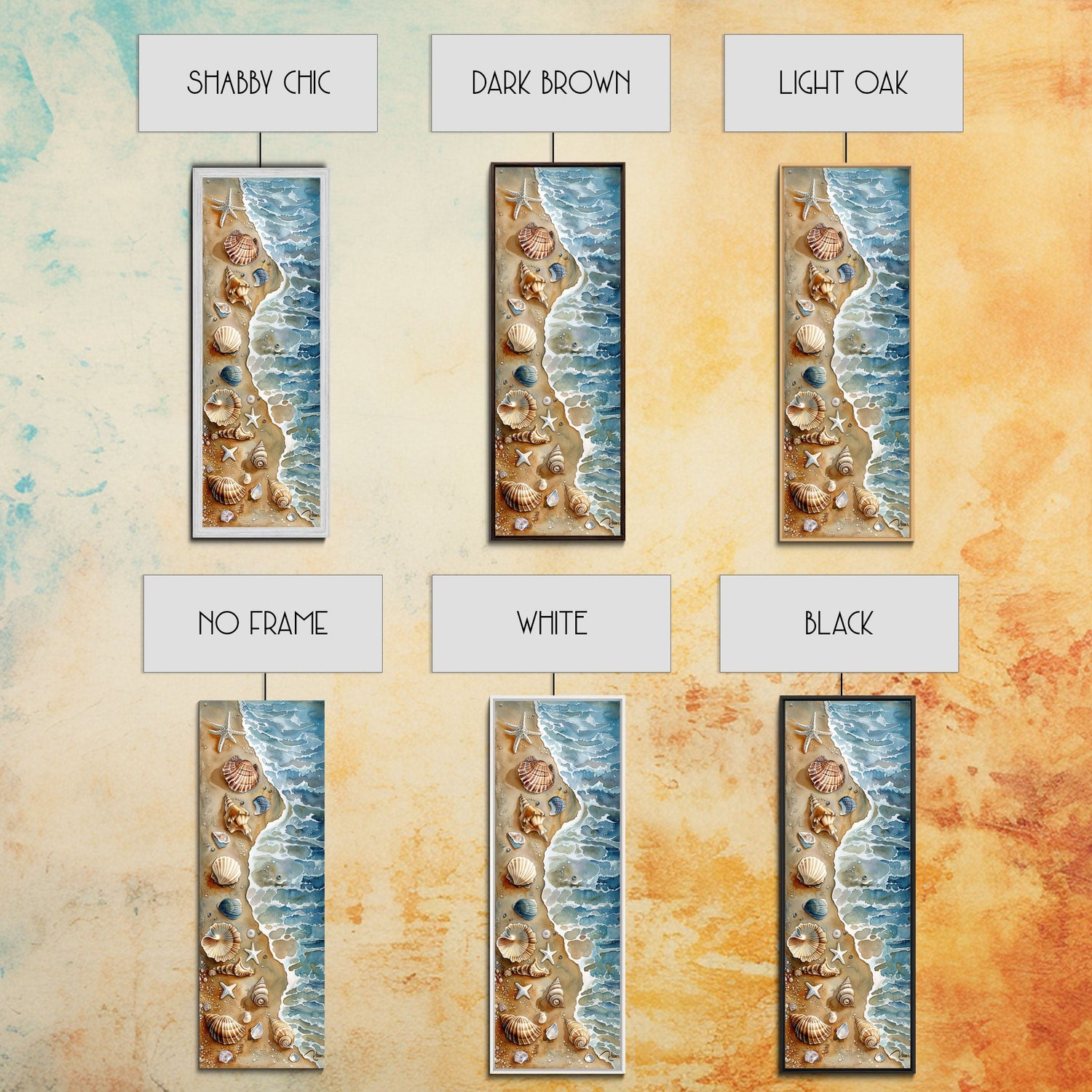 Seashells and Starfish Beach Art - Framed Canvas Print, Skinny Tall Art, Coastal Wall Art, Living Room Decor, Bedroom Art, Seashell Painting