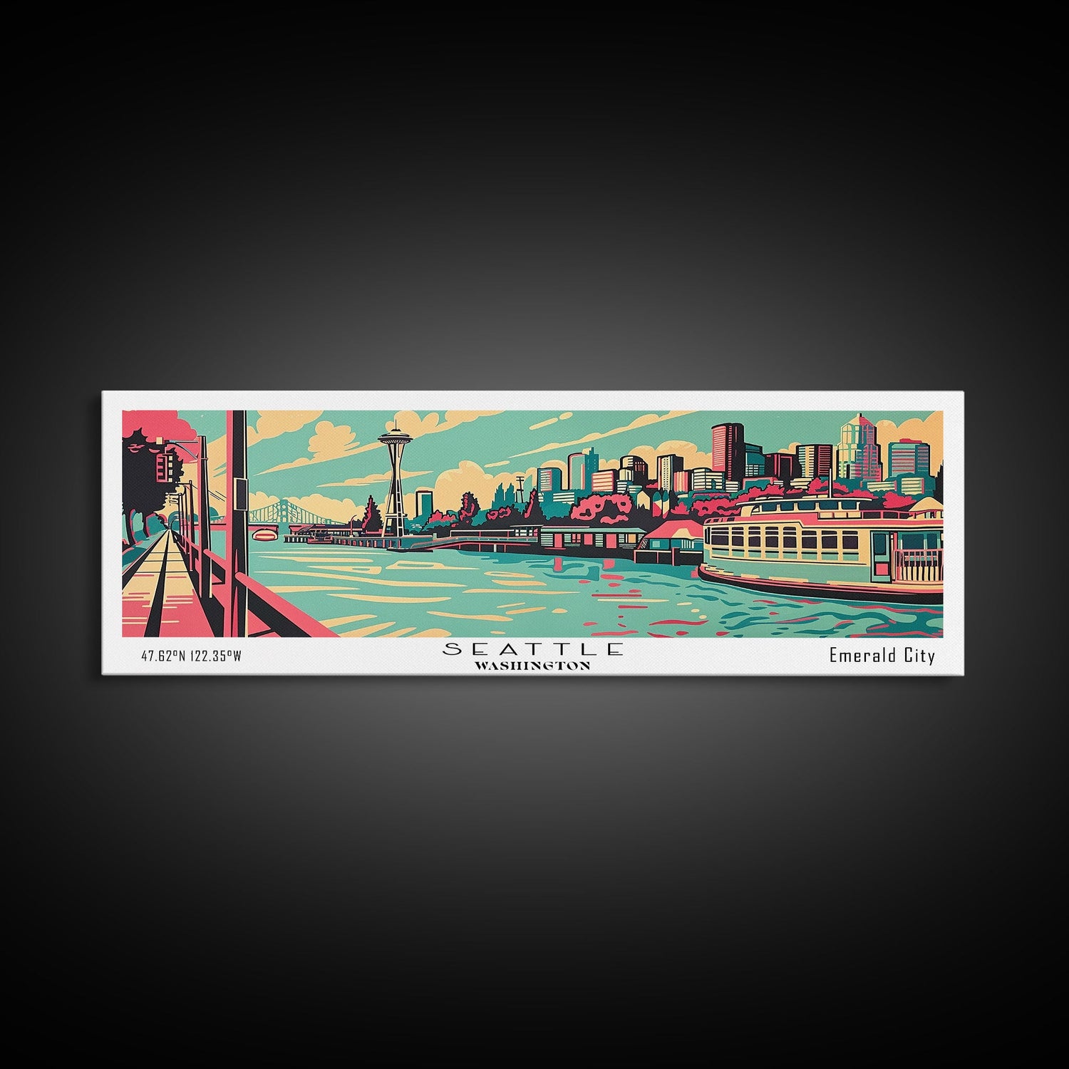 Seattle Washington Panoramic Painting Framed Canvas Print, Travel Poster, Mid Century Modern Art, Pop Art Style, Wall Decor, Home Decor - 10x30 Inches / No Frame - Stretched Canvas Only is backordered and will ship as soon as it is back in stock.