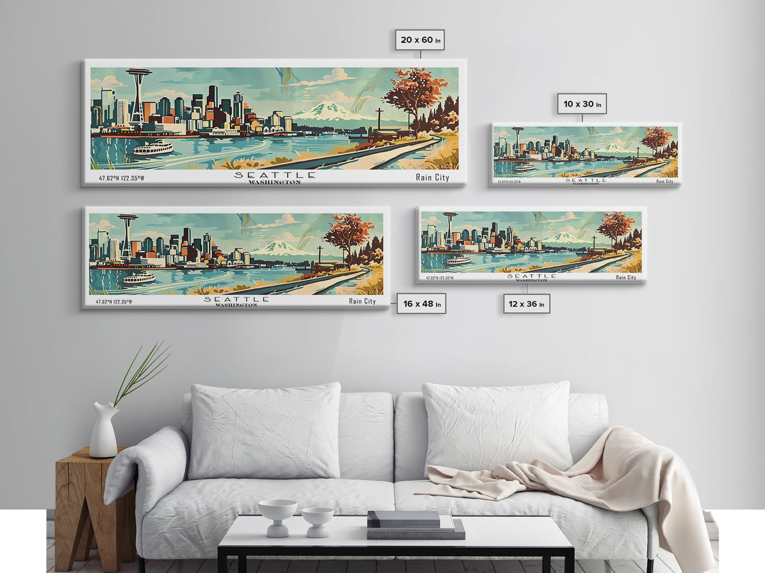 Seattle Washington Panoramic Painting, Mid Century Modern Framed Canvas Print, Retro Pop Art Travel Poster, Living Room Wall Art Decor - 10x30 Inches / No Frame - Stretched Canvas Only is backordered and will ship as soon as it is back in stock.