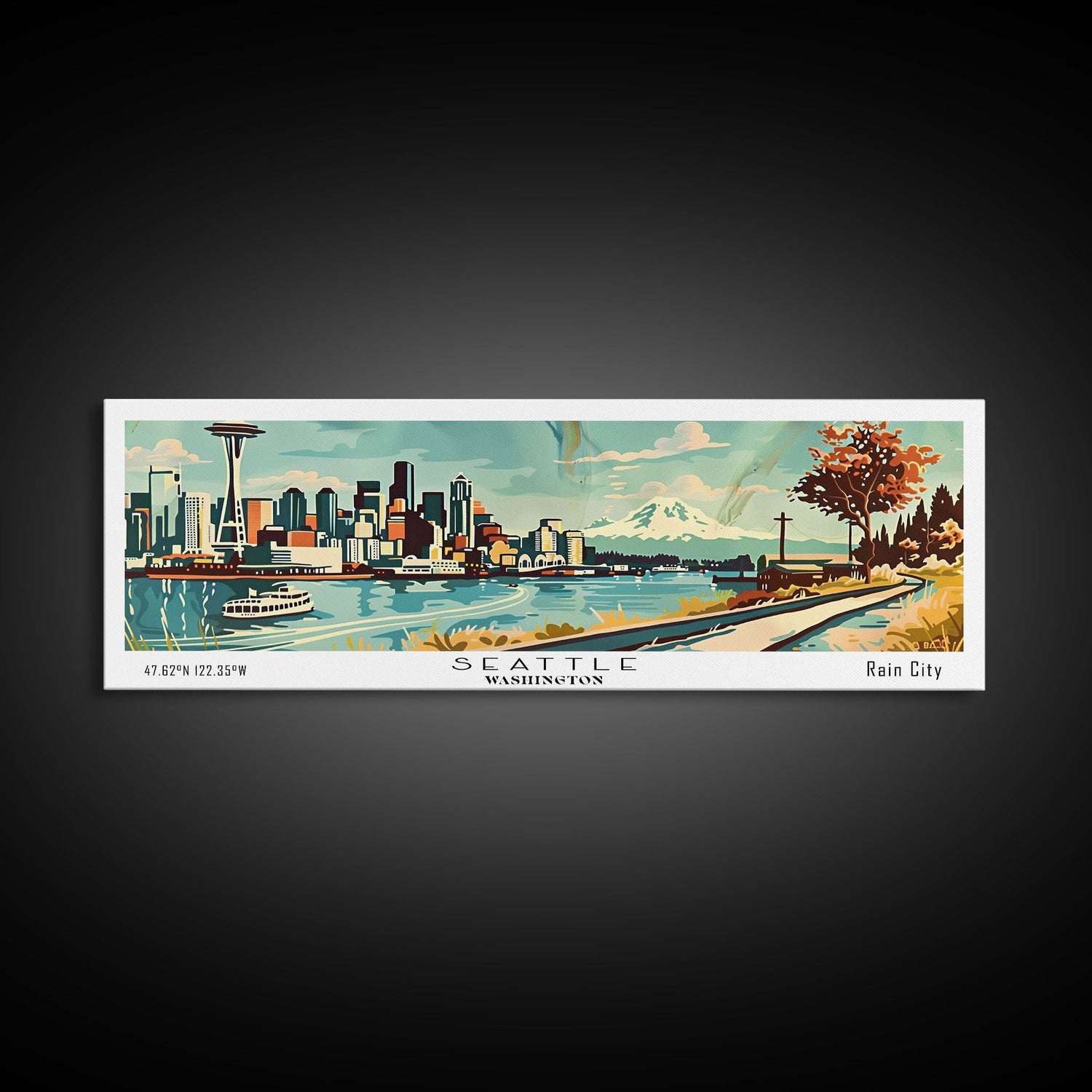 Seattle Washington Panoramic Painting, Mid Century Modern Framed Canvas Print, Retro Pop Art Travel Poster, Living Room Wall Art Decor