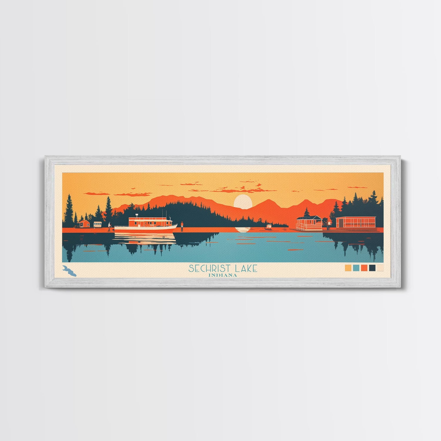 Sechrist Lake, Indiana Framed Canvas Print, Panoramic Travel Poster, Midcentury Modern Art, Living Room Decor, Pop Art, Wall Decoration