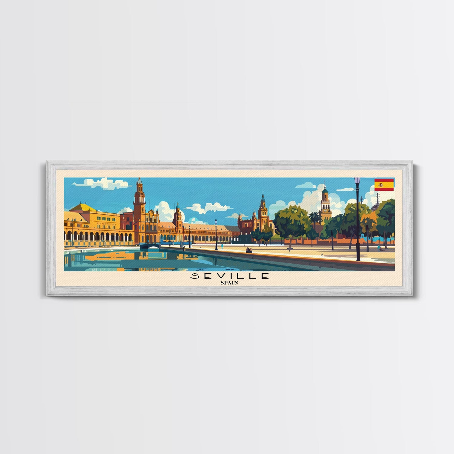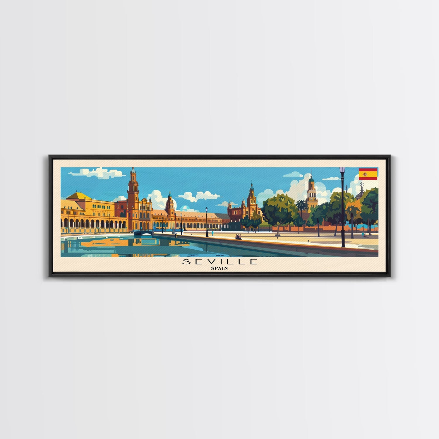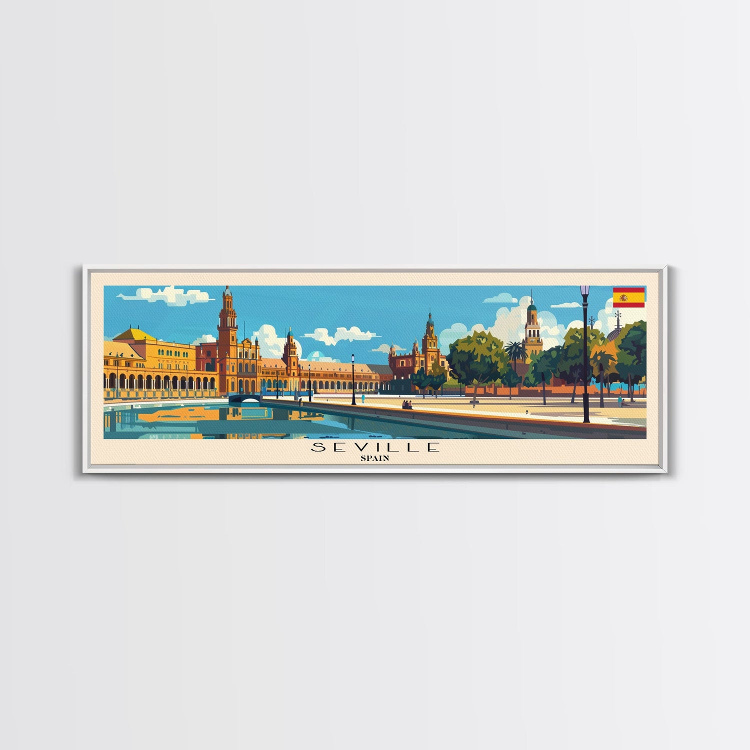 Seville Spain Panoramic Travel Poster, Framed Canvas Print or Metal Wall Art, Travel Art, Home Decor, Panoramic Painting, Midcentury Art